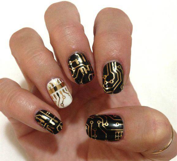 Изначально основа из фольги использовалась мастерами для покрытия всей поверхности ногтя. Однако изобретательные дизайнеры представили миру тонкие цветные ленты, которые легко крепятся, придавая маникюру футуристический вид. Как правило, такие полоски имеют глянцевую переливающуюся текстуру.