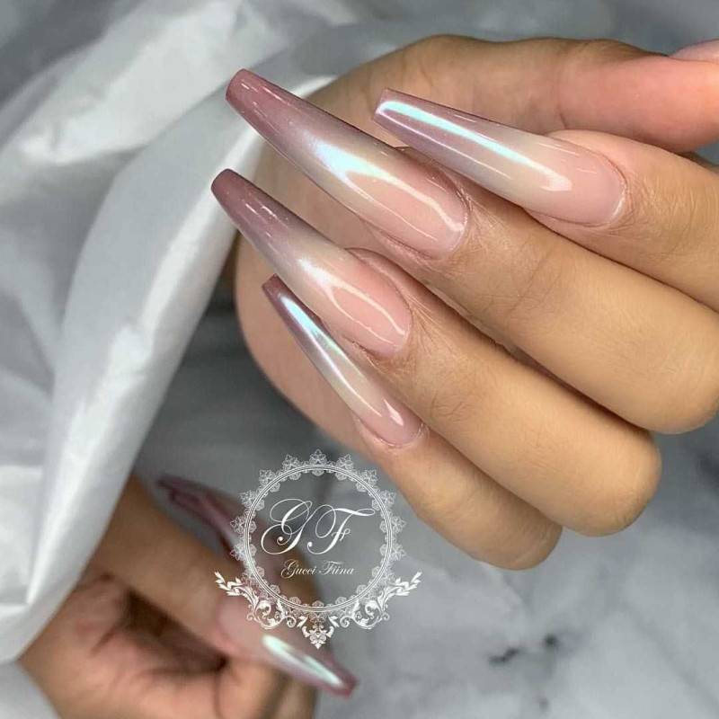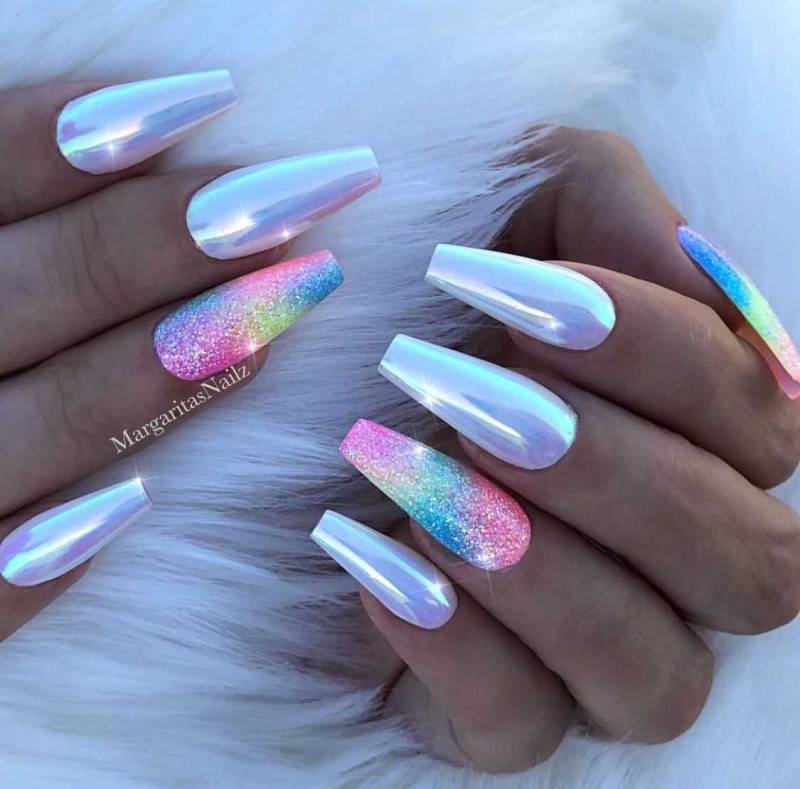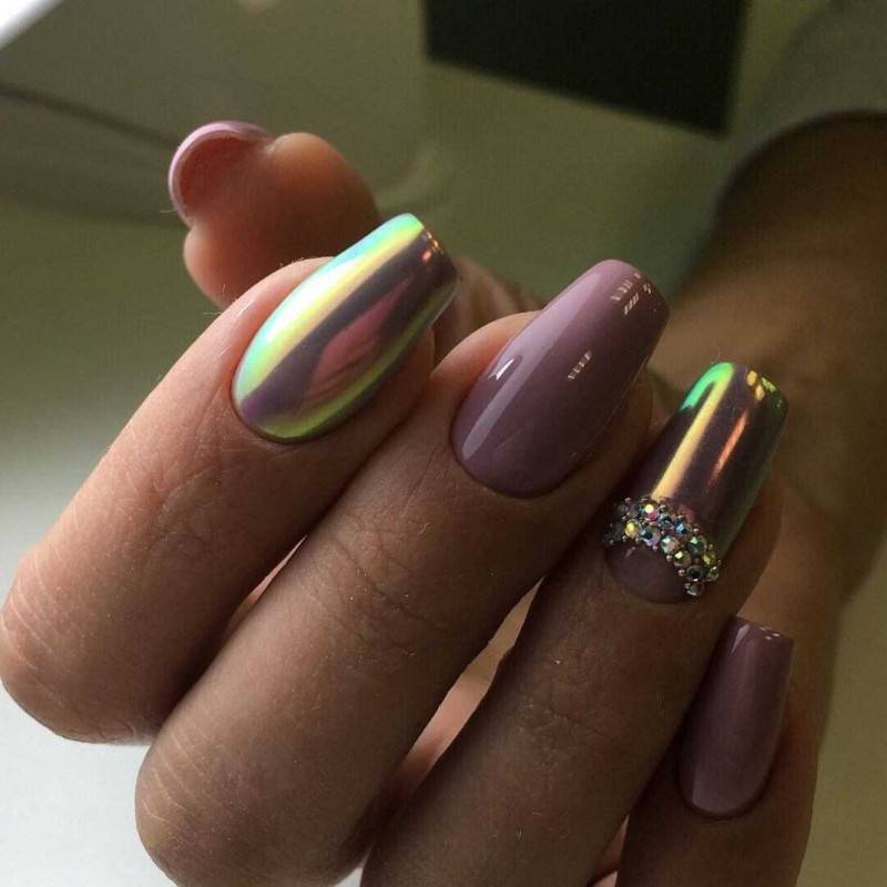 Руки с таким маникюром не могут не привлечь внимание. Дизайн с втиркой можно дополнить глиттером, фольгой, очаровательными принтами. Зеркальная втирка: