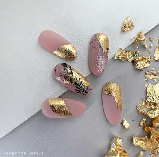 Самый простой и эффективный способ создать трендовый дизайн маникюра предполагает под собой использование базы с поталью разных цветов. Обязательное условие — это липкий слой у базы, иначе поталь не сможет приклеиться к ногтевой пластине.