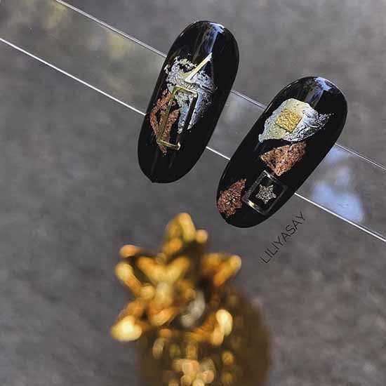 Фольгу можно использовать в виде кусочков разной формы, напоминающих битое стекло. Короткий маникюр с фольгой можно дополнить графическими и геометрическими рисунками.