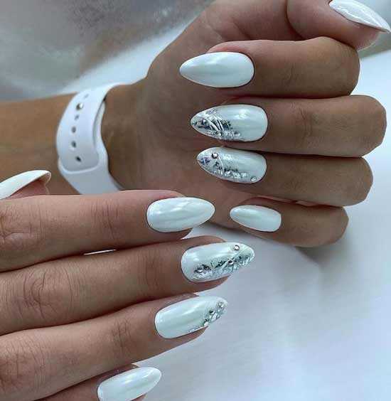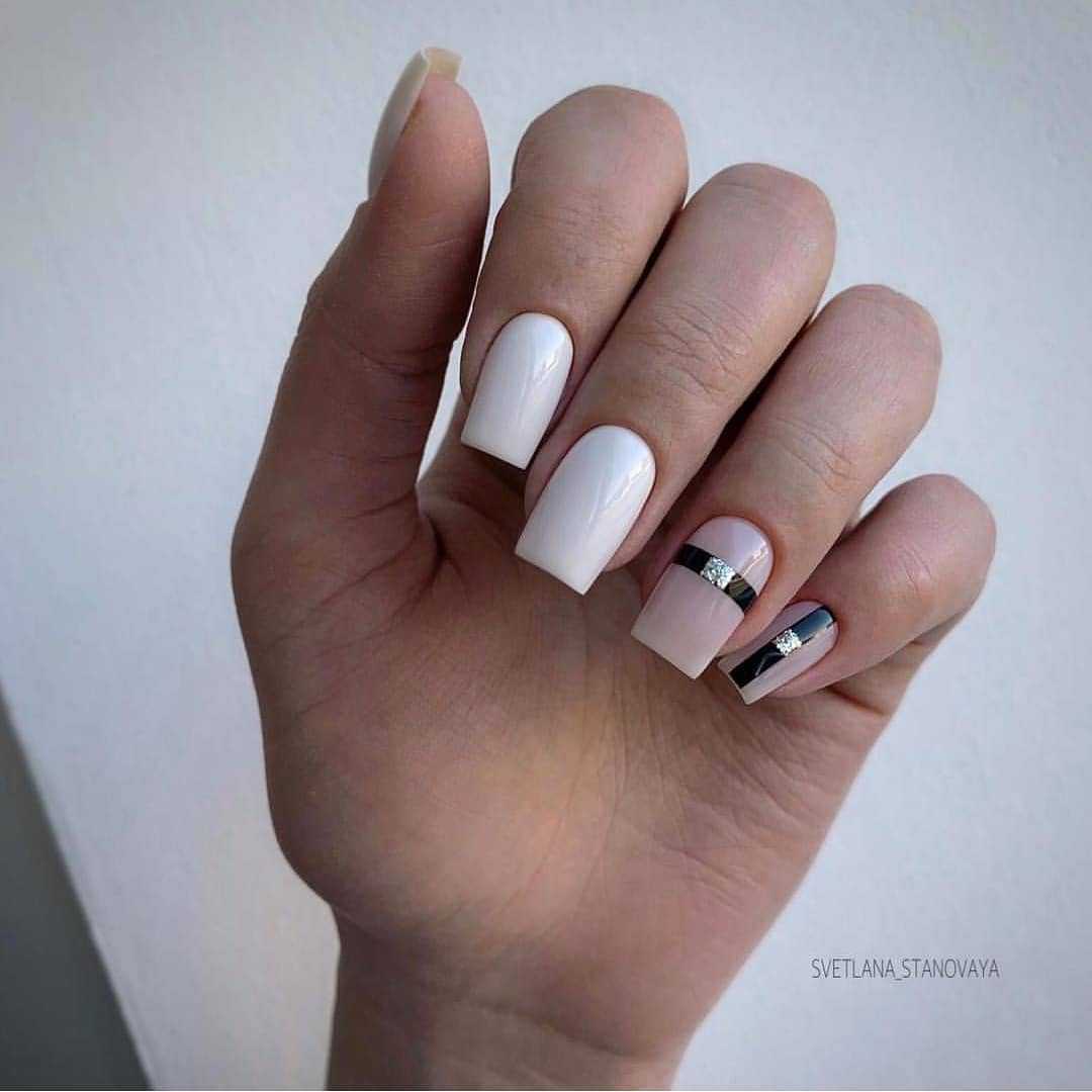 Золотая фольга отлично перекликается и сверкает на белом или же молочном лаке. Чтобы создать стильный дизайн потребуется выбрать молочный и белоснежный гель-лак с липким финишем. Закрасьте одну часть ногтевой пластины белый, а другую молочным гель-лаком. Старайтесь, чтобы границы были ровными и равномерно прокрашенными.
