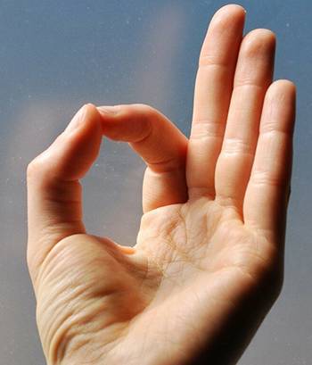 - Чинмайя-мудра — указательные и большие пальцы соединены в кольцо, остальные пальцы согните так, чтобы они кончиками касались оснований пальцев.