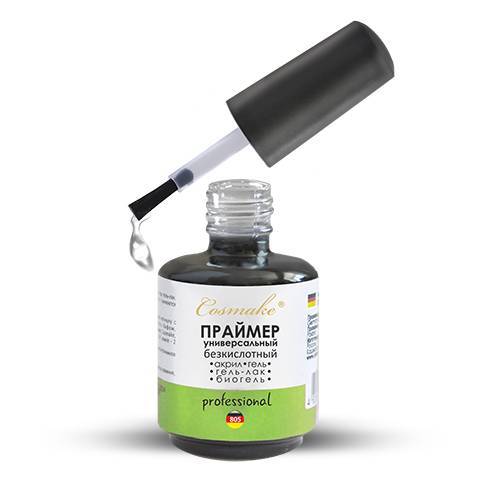 Кислотный праймер (acid primer) — основным компонентом большинства Acid Based праймеров является метакриловая кислота. Праймер глубоко обезжиривает и обезвоживает ногти. Способствует открытию чешуек ногтевой пластины, которые поднимаются и позволяют зацепиться за них материалу для наращивания ногтей, таким образом формируется крепкая связь. Этот праймер преимущественно применяют при наращивании ногтей. Его нужно обязательно использовать перед наращиванием ногтей гелем или акрилом. Помимо обеспечения хорошей сцепки материала с ногтем, праймер также лишает ногти среды для развития микроорганизмов. Если ногти не обработать праймером перед наращиванием, после наращивания возникает парниковый эффект, количество микробов увеличивается и поскольку в гель они проникнуть не могут, то начинают проникать в ноготь. Сначала на ногтевой пластине появляются зеленоватые пятна, потом они становятся коричневатыми, следующая стадия – развитие онихомикоза. В обязательном порядке кислотный праймер нужно наносить на «проблемные» ногти, т.е. сильно жирные, глубоко посаженные, обгрызенные и особенно, если у клиента влажные руки. Незаменим кислотный праймер и при наращивании на ногах.