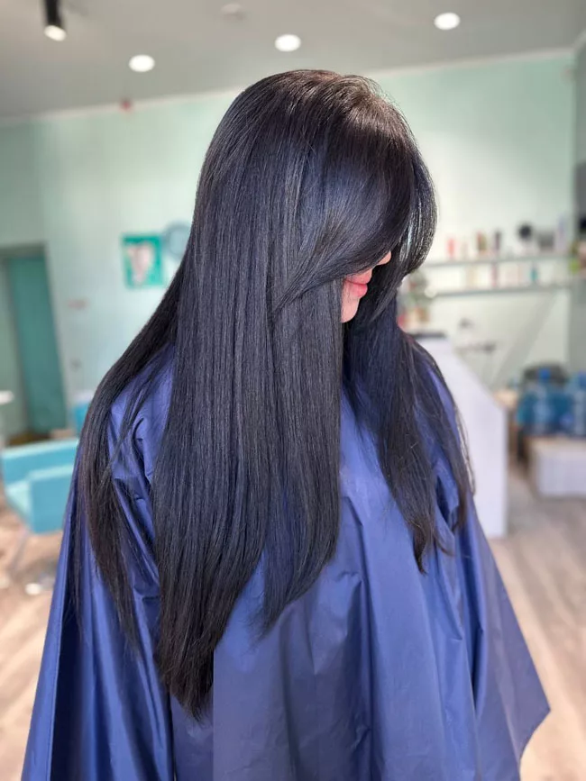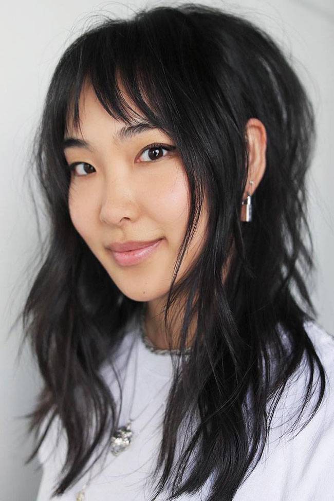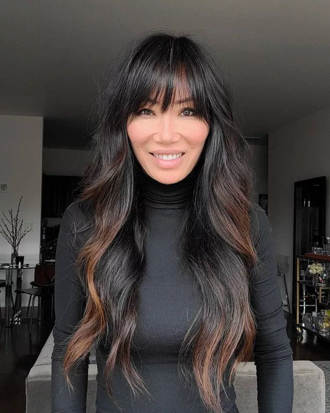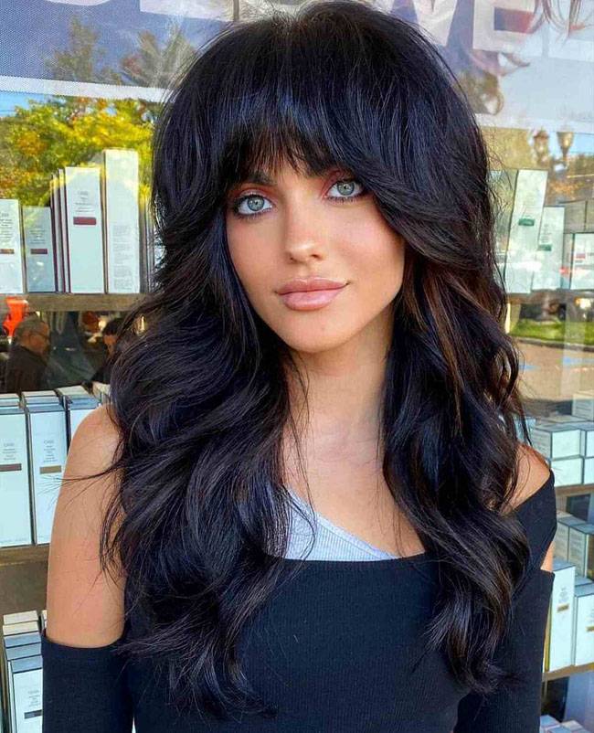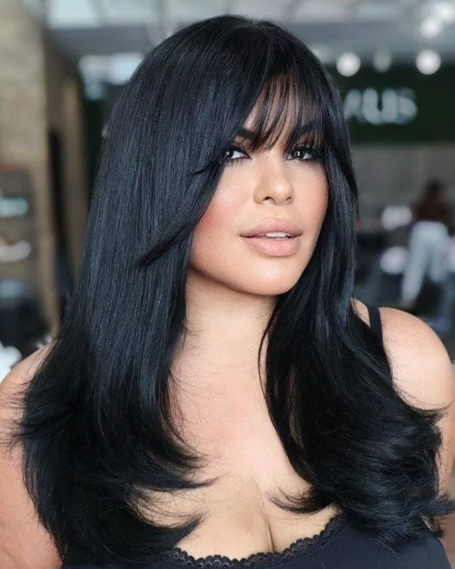 2024 год определенно будет годом объема. На черных локонах красиво смотрятся прямые и ровные концы и более свободные локоны, с пышной челкой.Если вы не любите слои и формы, прямой челки может быть достаточно.