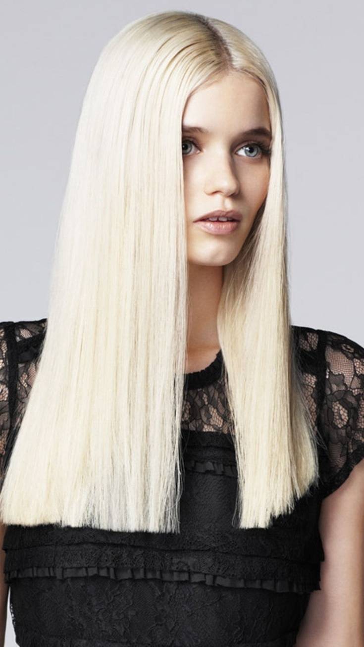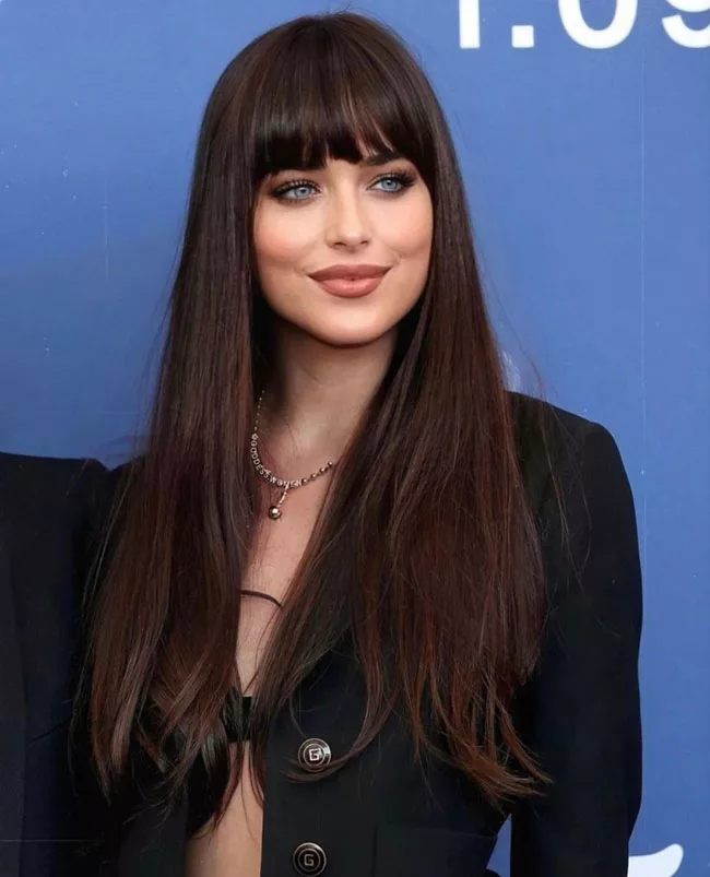 - Длинная прямая чёлка. Её длина может быть вариативна. Чаще всего девушки выбирают среднюю длину, однако чёлка может доходить и до самых глаз, закрывая брови. В этом случае презентабельность её внешнего вида полностью зависит от качества волос, потому что такая чёлка смотрится эффектно только в том случае, если она очень густая и гладкая. Эффектно подчёркивает глаза.