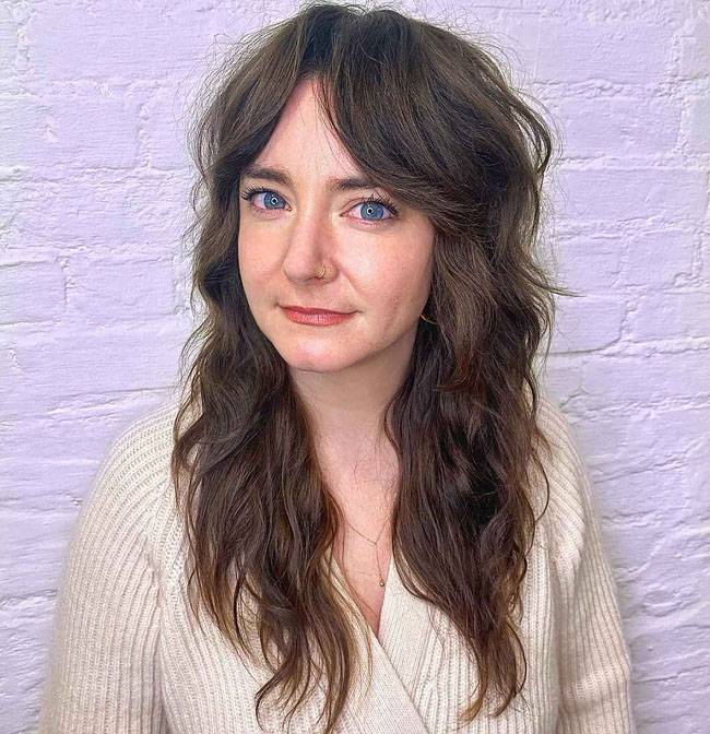 Делает прическу пышной, придавая ей объем. Прекрасно сочетается с длинными и густыми волосами. На таком варианте челки обычно выполняют зубчатый и рваный срез.