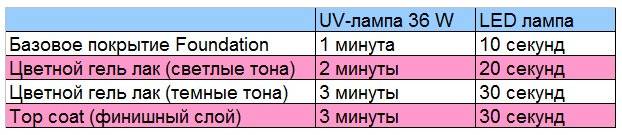 | Скорость высыхания | УФ-лампа мощностью 36 Вт (2 минуты) или LED-лампа (30-60 секунд) | время просушивания следует увеличить в 1,5 и даже 2 раза | ||