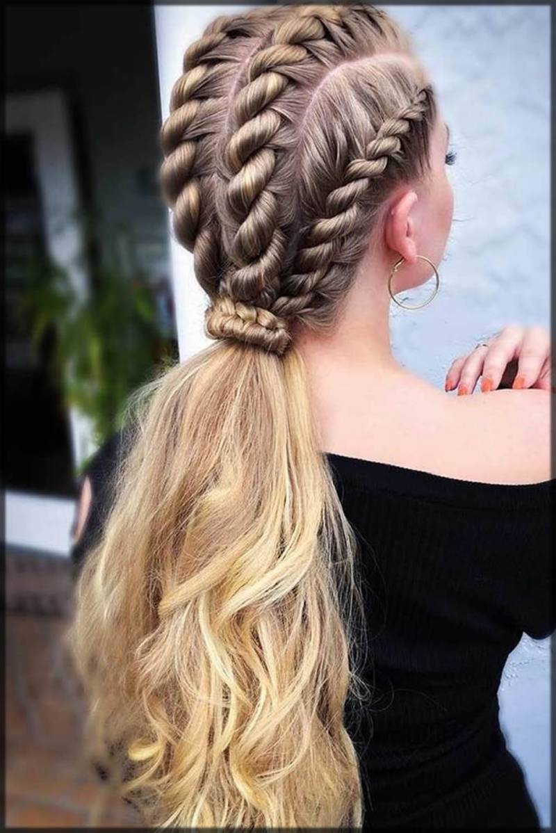 Соберите волосы в высокий конский хвост и сделайте из него обычную трехпрядную косу. Затем закрепите ее заколками на макушке головы. Этот стиль придает объем и текстуру волосам и выглядит очень элегантно.
