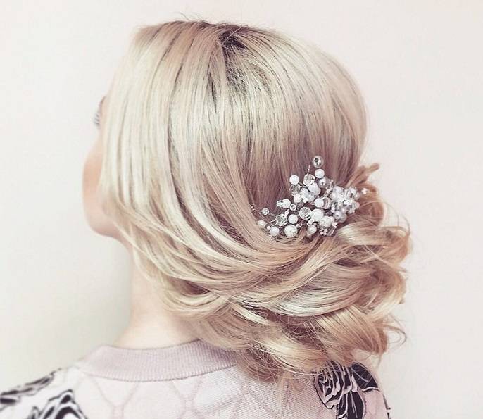 - Закрепить полученный вариант прически невидимками или шпильками с украшениями и распылить над головой лак для фиксации.