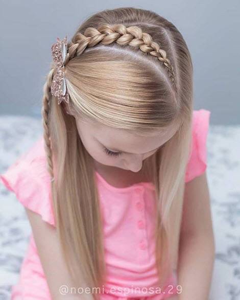 Разделите волосы на две части и сделайте на каждой из них обычную трехпрядную косичку. Затем перекрестите их на затылке и сделайте из них бантик, закрепив заколками. Эта прическа выглядит очень красиво и стильно.