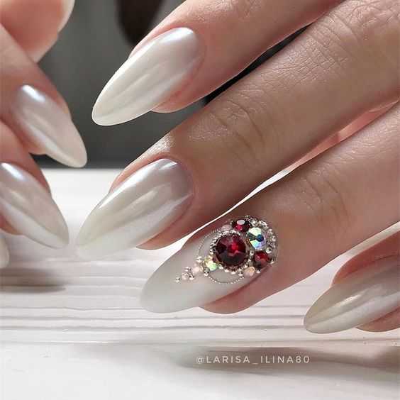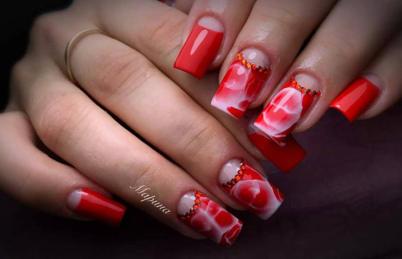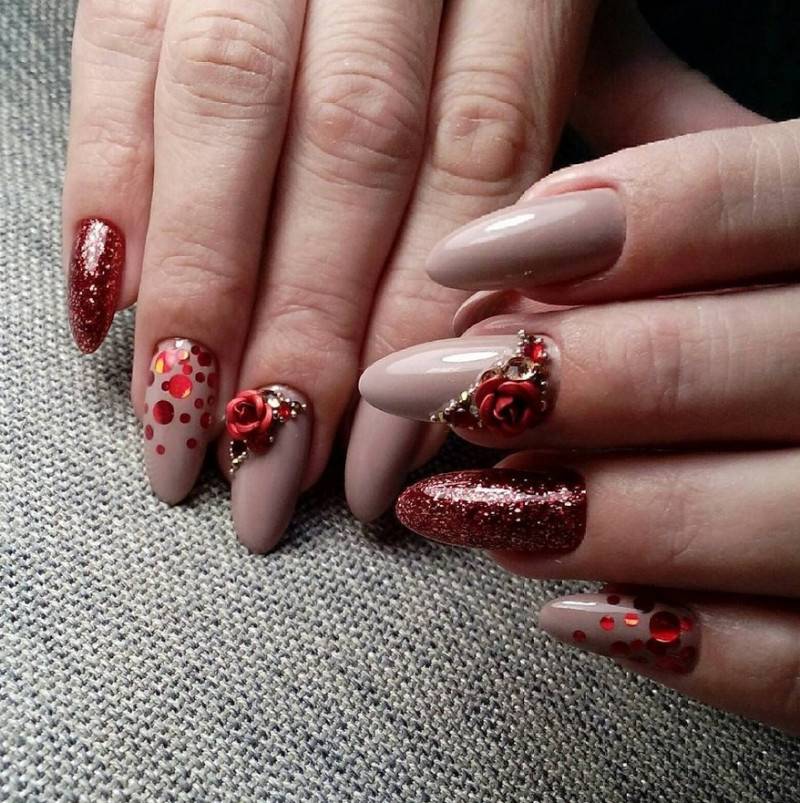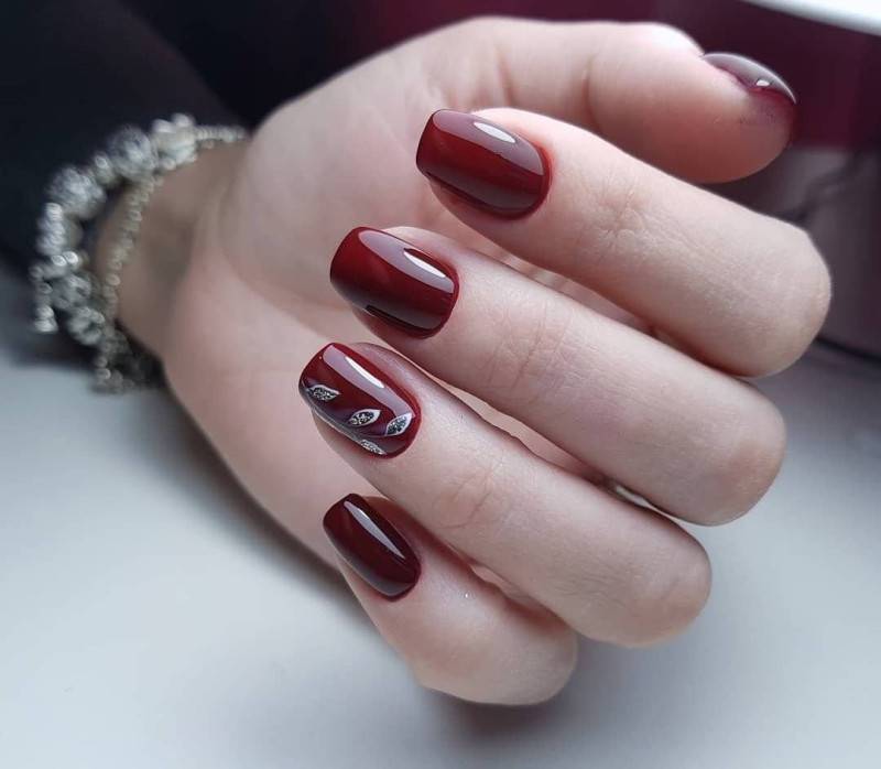 - Красные и бордовые. Оттенки этих цветов изысканно смотрятся и на коротких, и на длинных ногтях. Винные, вишнёвые оттенки в сочетании со стразами создают великолепные вечерние образы.