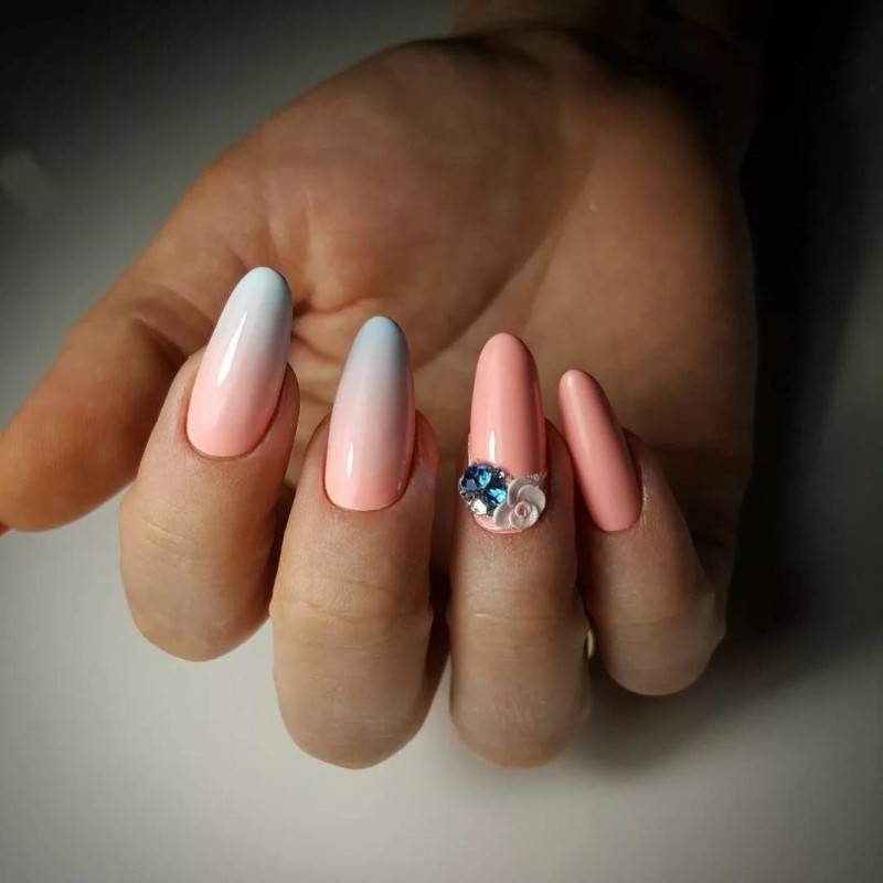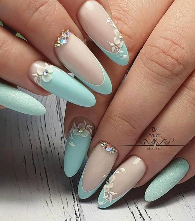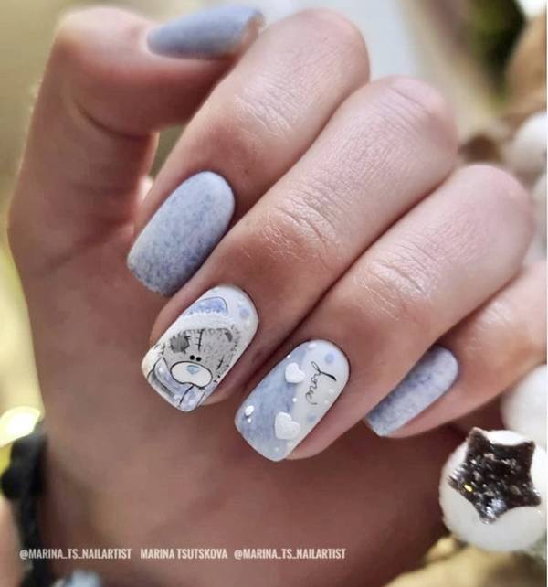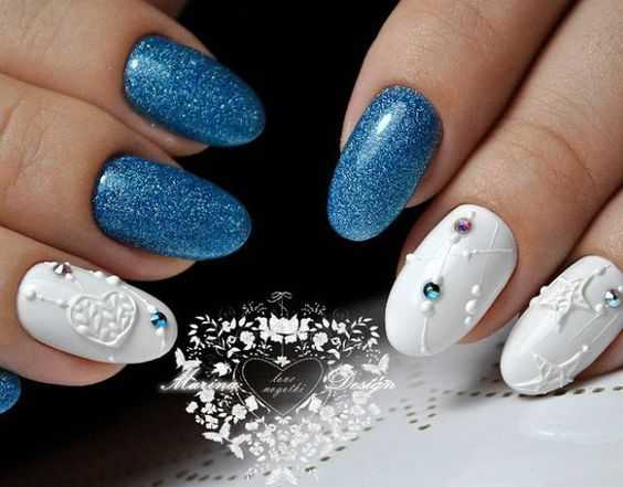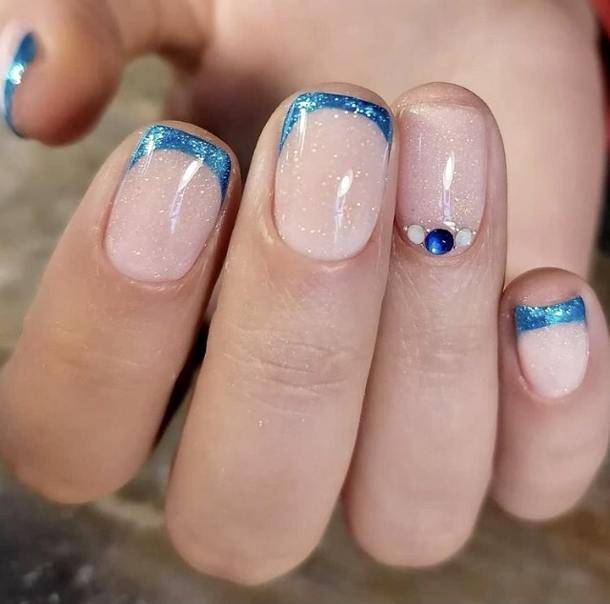 - Голубой. Этот цвет занимает «пальму первенства». Его украшают стразами, блестками, делают на нем рисунки, присыпают пудрой.