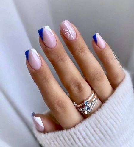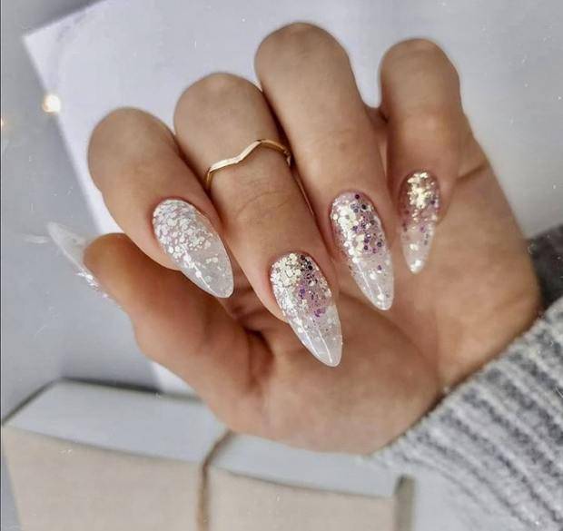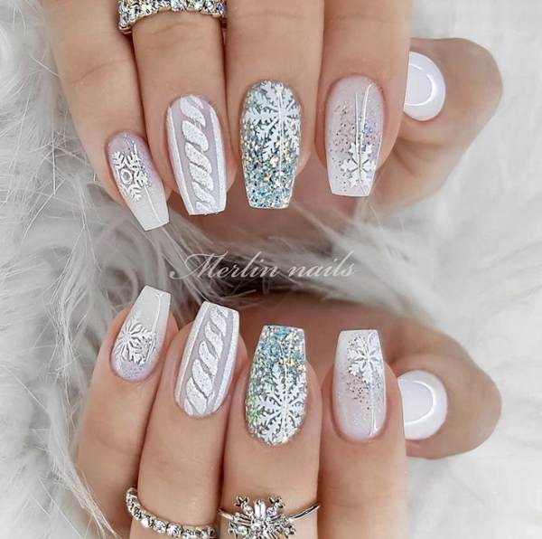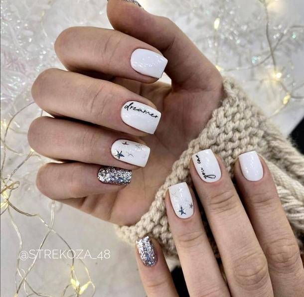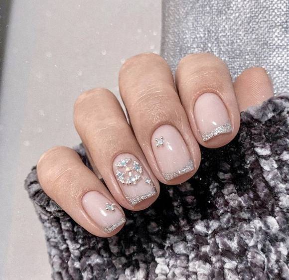 Нежно и модно смотрится классический белый нежный френч в сочетании с блестками и снежинками.