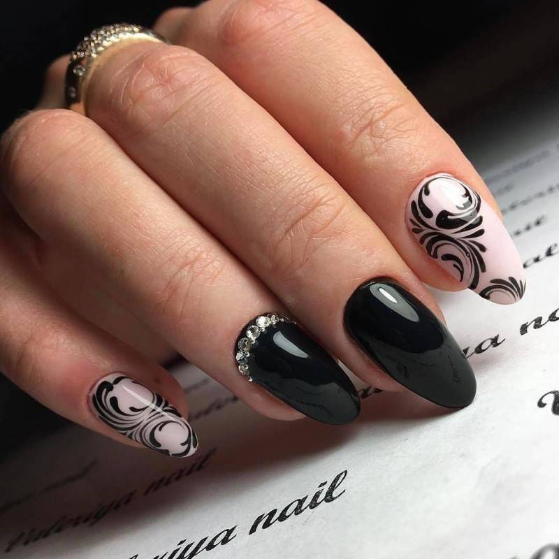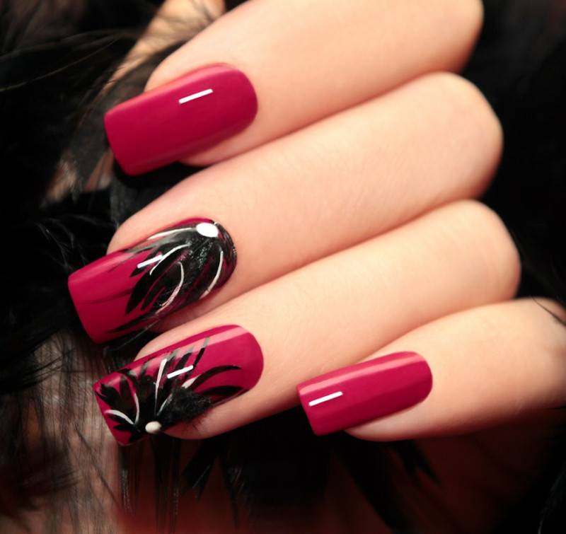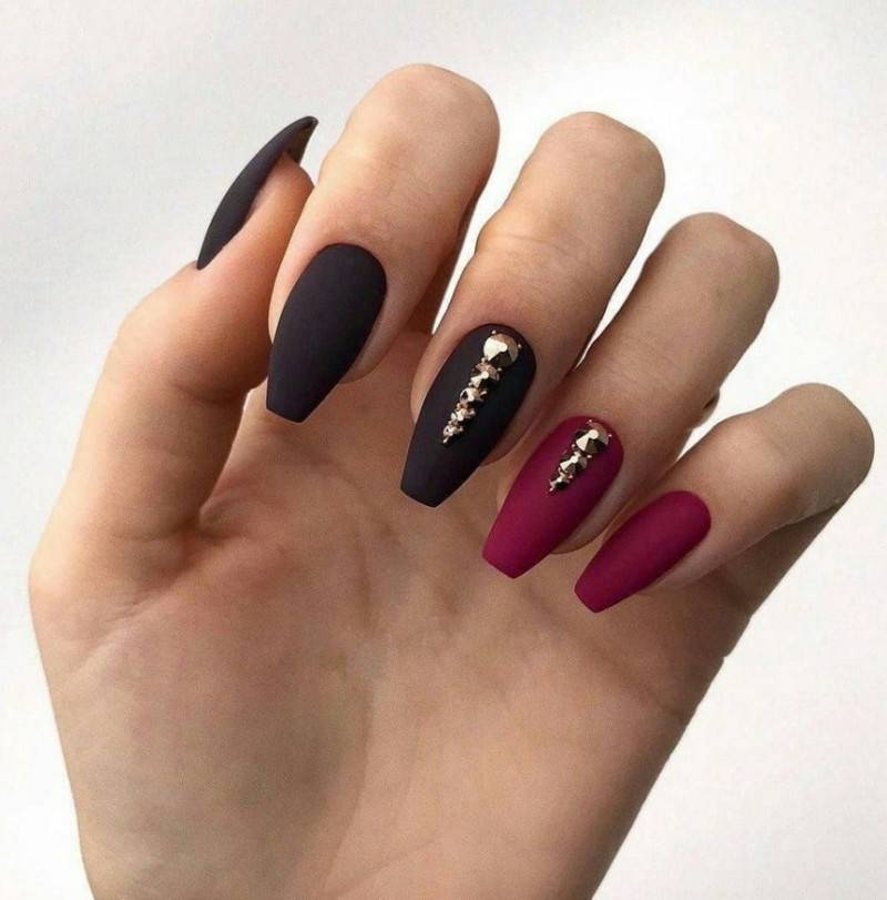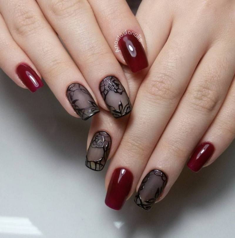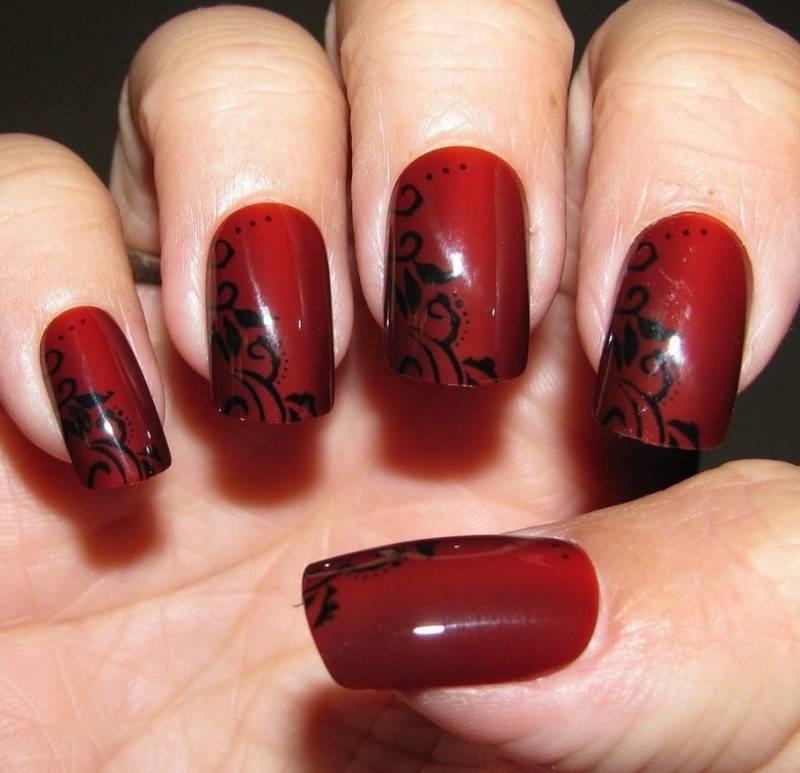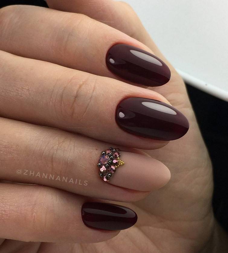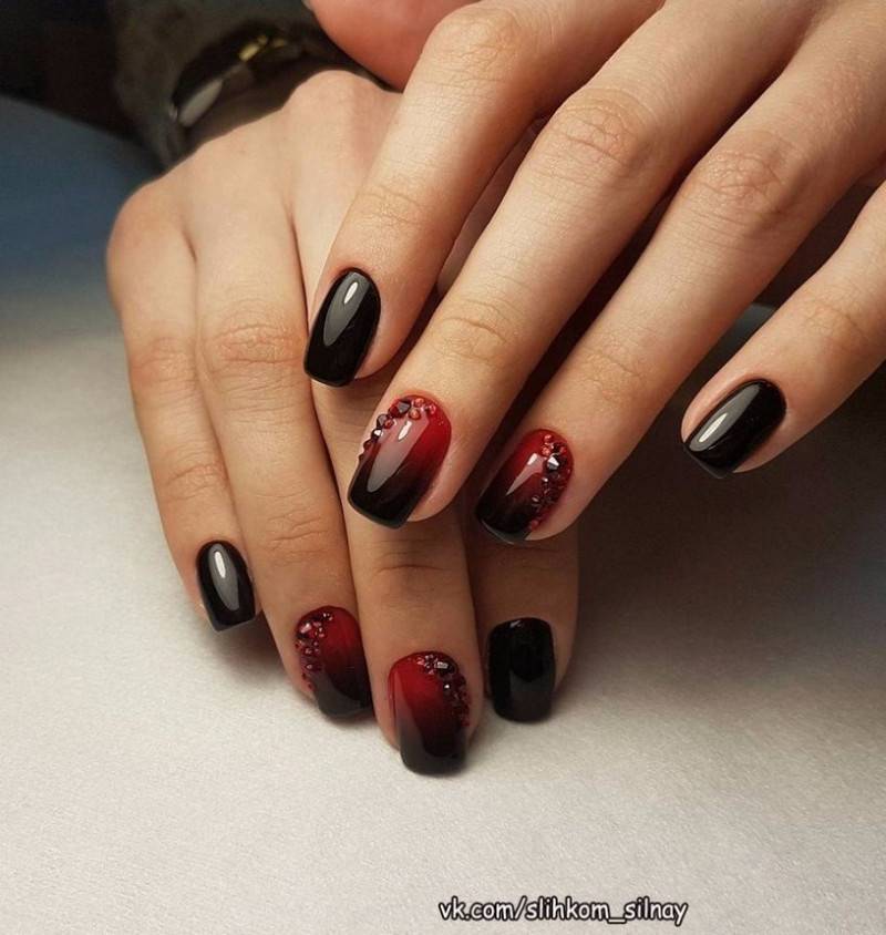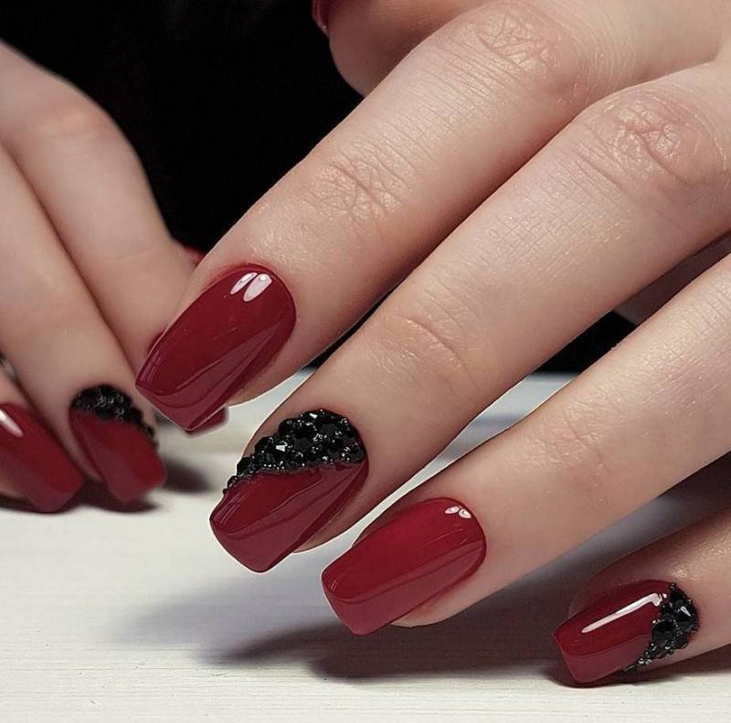 Подобный дизайн даже по фото может показаться мрачным, траурным. Чтобы такого ощущения не сложилось, нужно подобрать правильный оттенок бордо. Лучше сделать его светлым, например, винным или нежно-брусничным. Чёрный с бордовым отлично комбинируются в технике градиент. Его выполняют с переходом от самого тёмного основания к светлым кончикам ногтей. Для торжественных случаев можно окрасить чёрным лаком один-два ногтя на руке и декорировать стразами – дизайн получится дерзким и смелым.