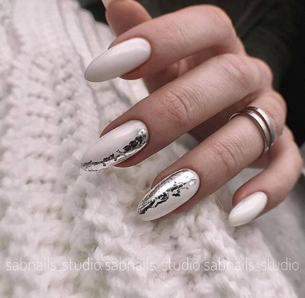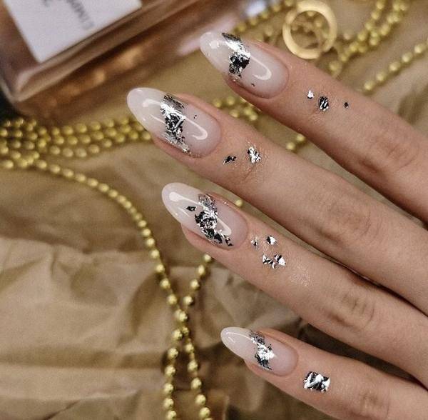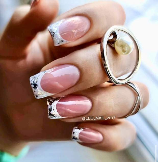 Очень стильно и празднично смотрится белый френч с отпечатками серебристой, золотой или красной фольги.