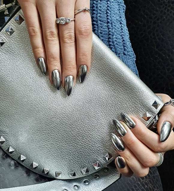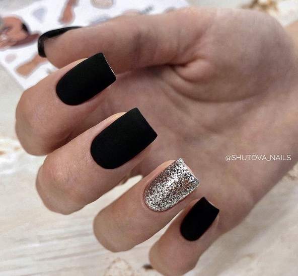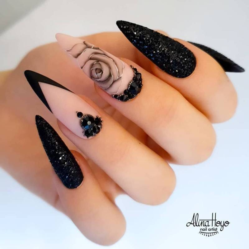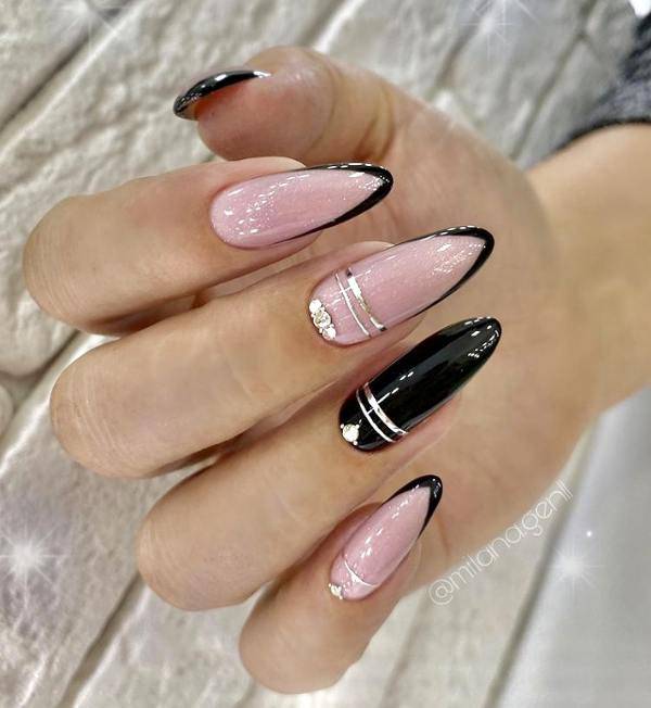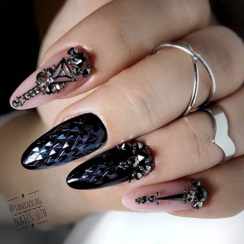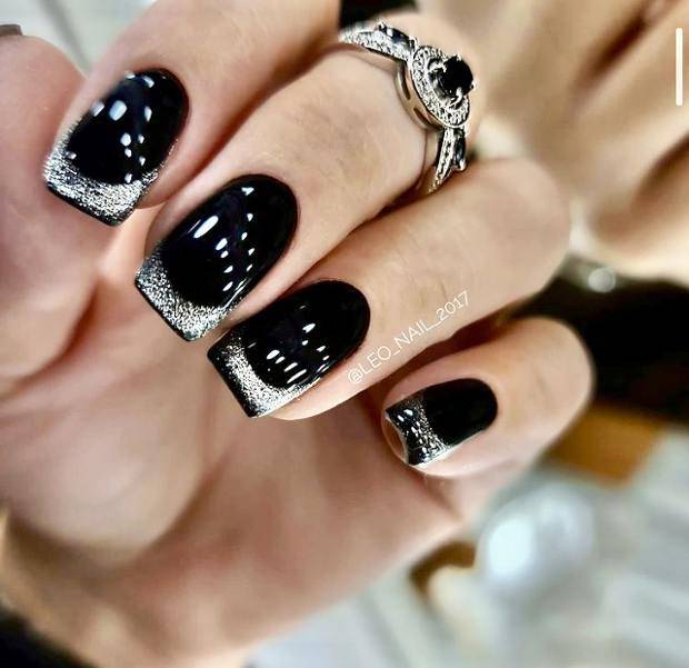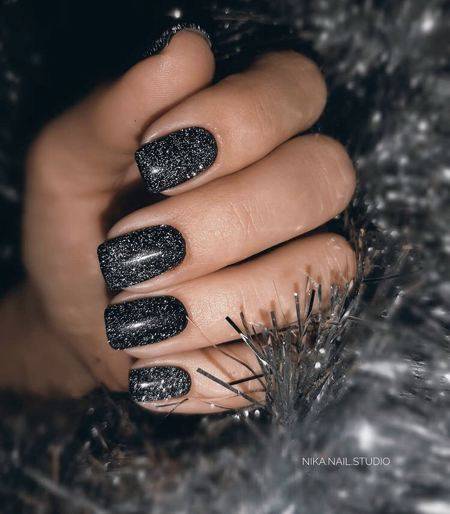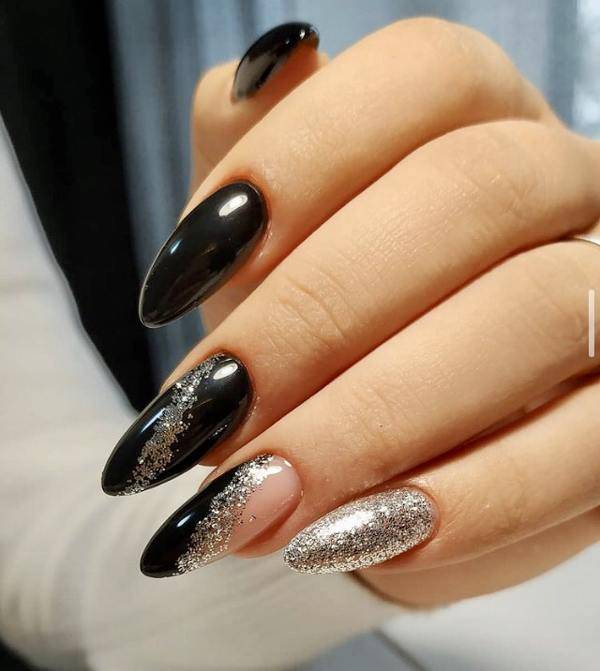 Стильно и эффектно будут смотреться длинные миндалевидные ноготки черного цвета, украшенные серебристыми блестками.