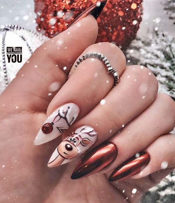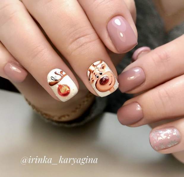 Новогодний маникюр с рисунком оленя.