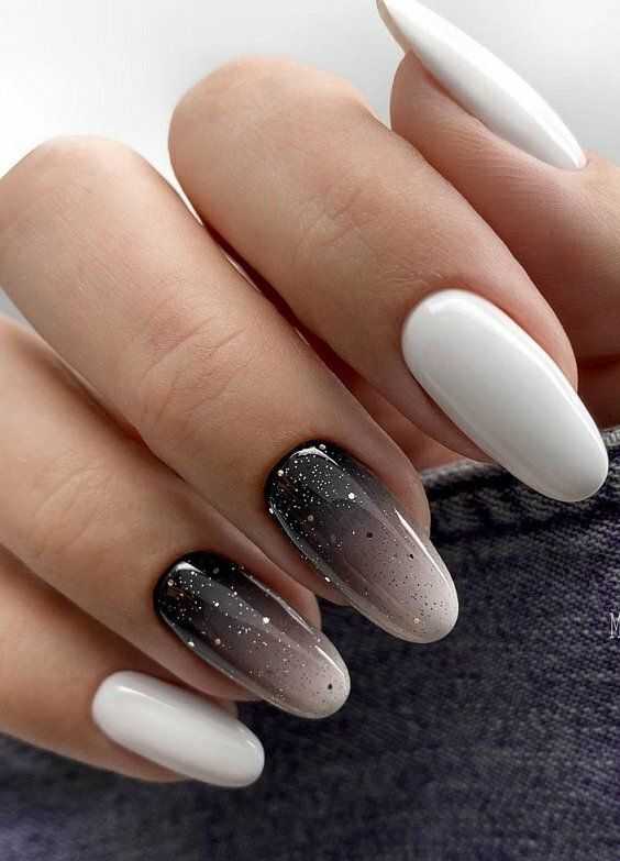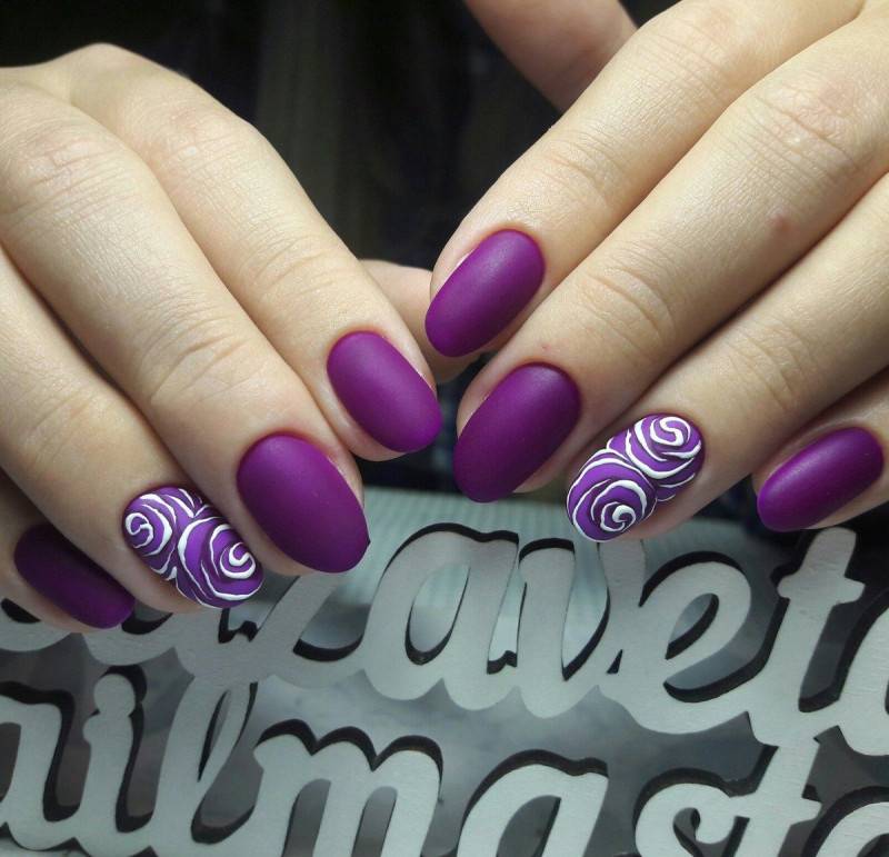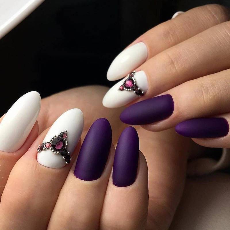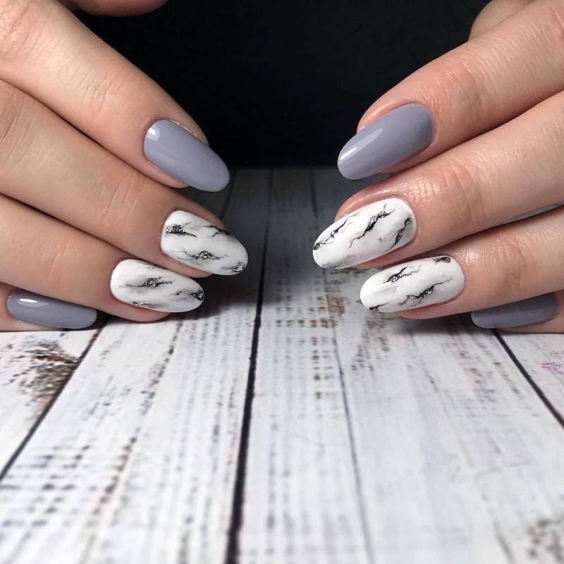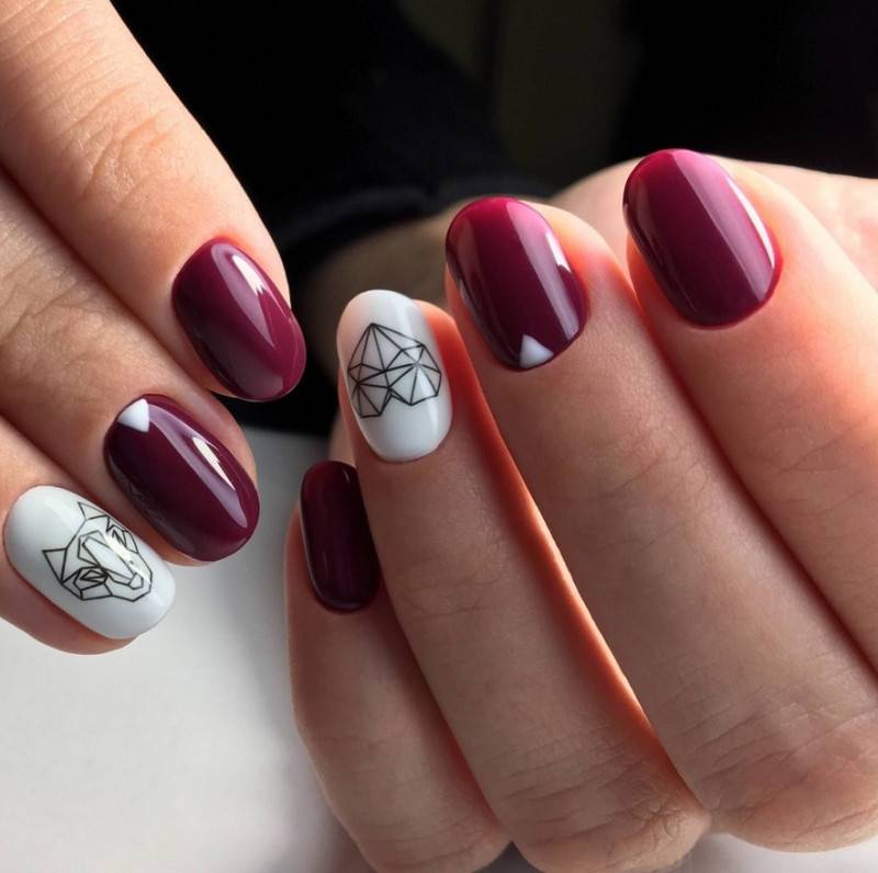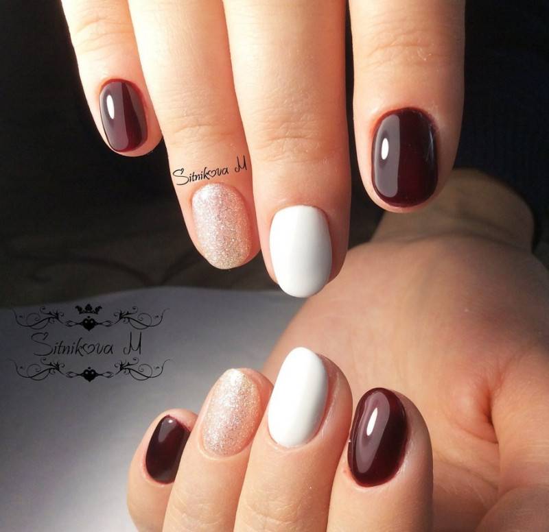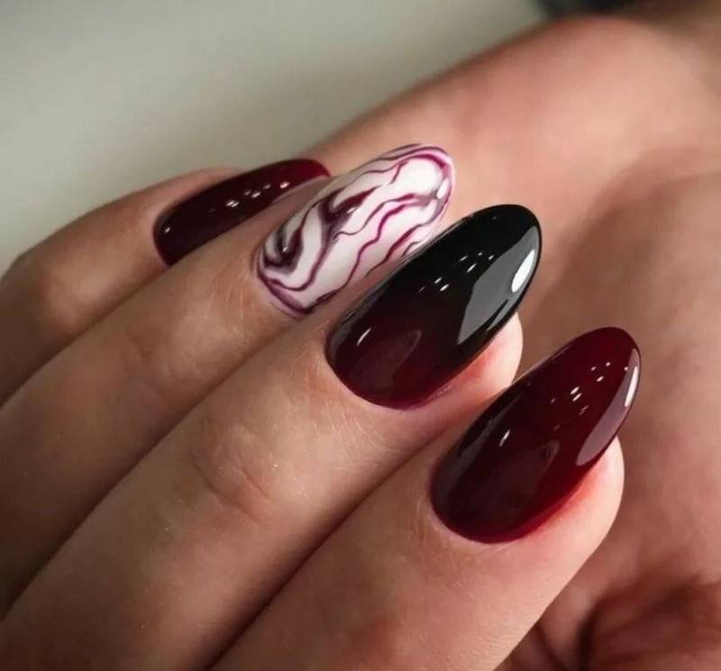 Сделать нейл-дизайн нежным и чувственным можно с помощью добавления белого цвета. Он разбавит насыщенность тёмного оттенка и придаст ему больше изысканности. Особенно хорошо такой дуэт смотрится на длинных ногтях, если использовать оба оттенка примерно в равных пропорциях. Чтобы разнообразить стиль, можно заменить белый на молочный и применять мраморный дизайн.