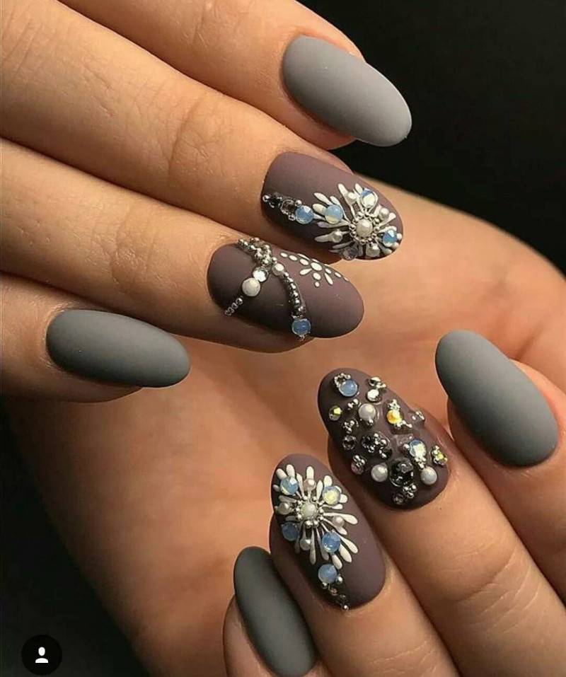 Сиреневый и цвет индиго с темно-серым или голубым придадут мистики на ногтях. Повседневная цветовая палитра основана на сочетании серого, пепельно-коричневого и хаки. Натурально будут выглядеть сочетание синего с карамельным или бежевым.