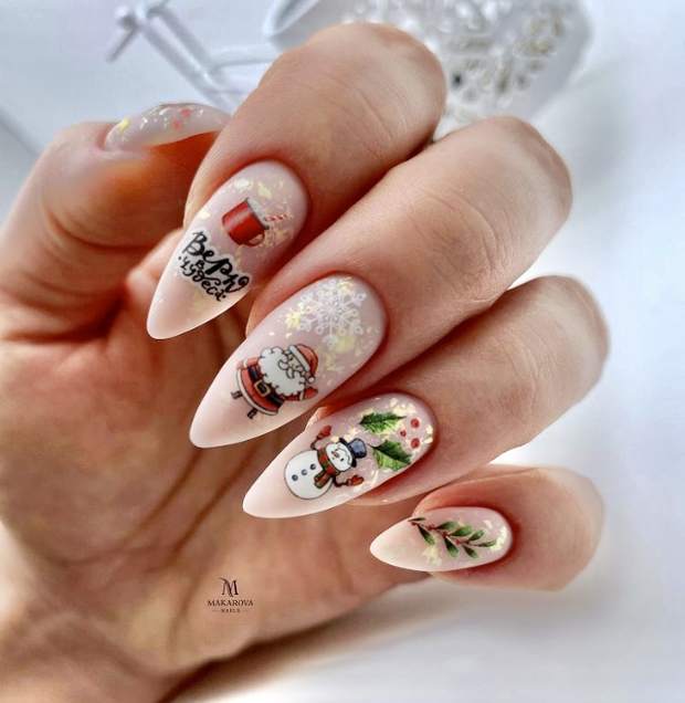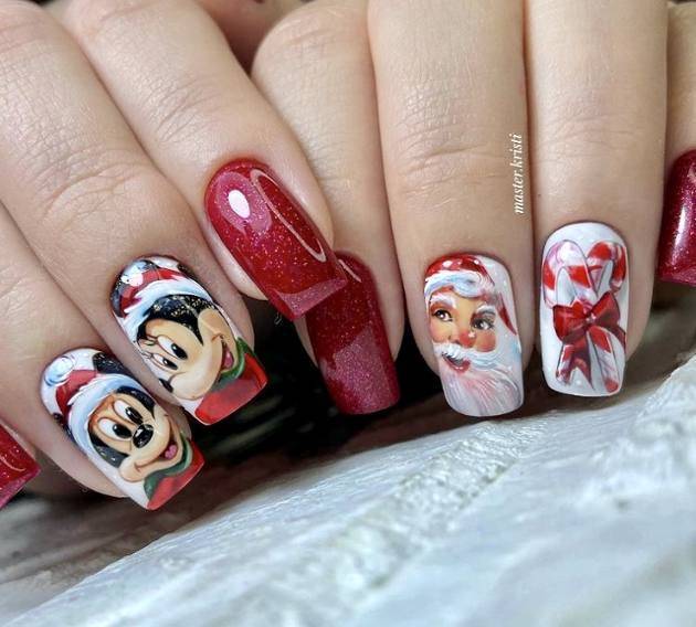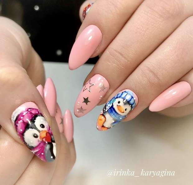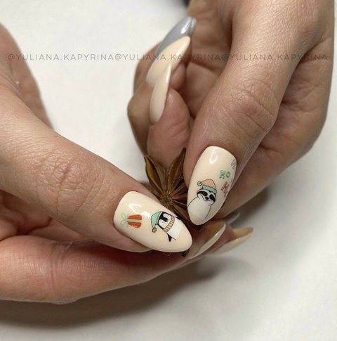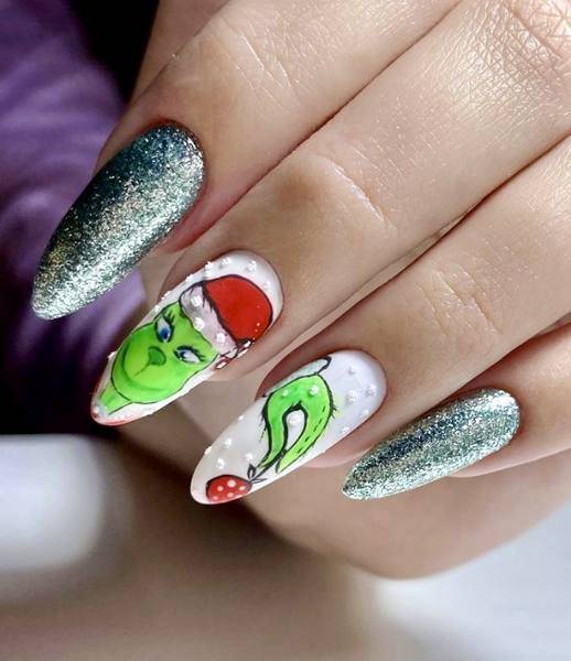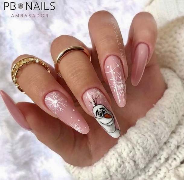 Посмотрите какие красивые и необычные Новогодние рисунки сказочных и мультяшных персонажей, можно добавить к праздничному дизайну ноготков. Например, снеговика Олафа, Микки мауса, пингвинов или даже Гринча.