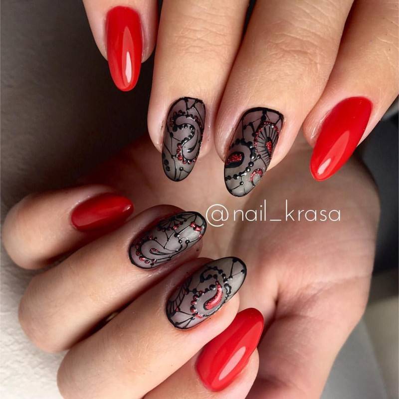 Для любительниц дизайнов на ногтях можно сочетать несколько цветов. В классическое сочетание белого с черным можно добавить немного красного. Это придаст некий шарм маникюру.