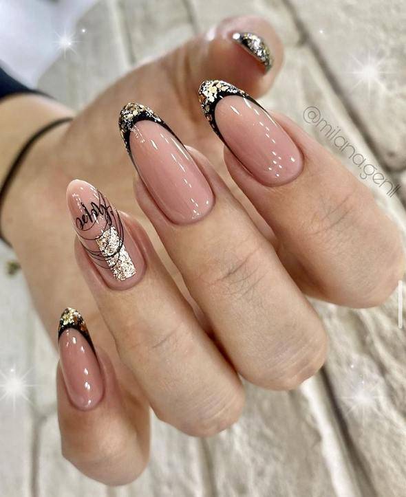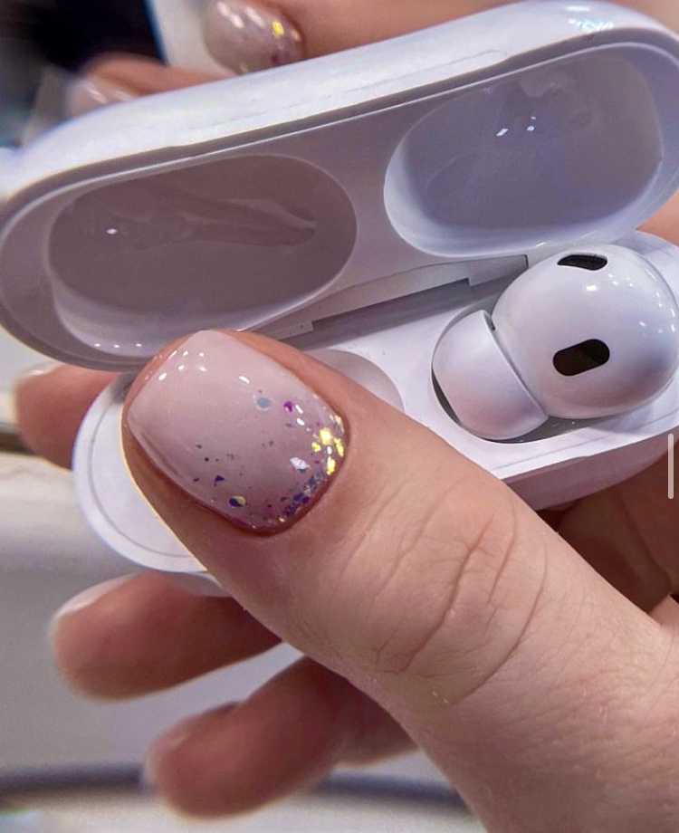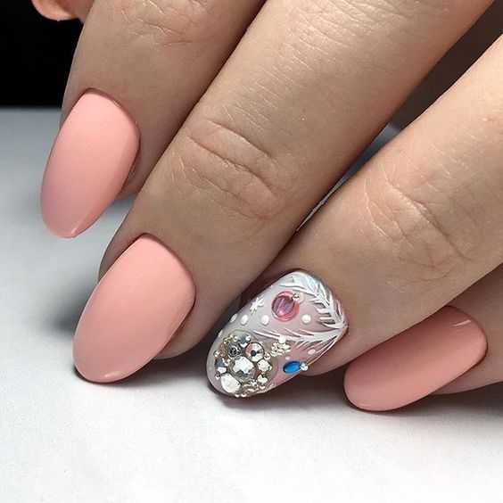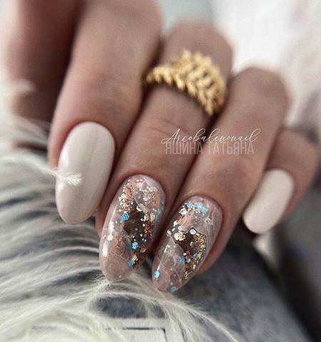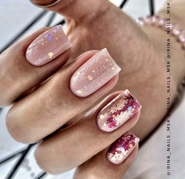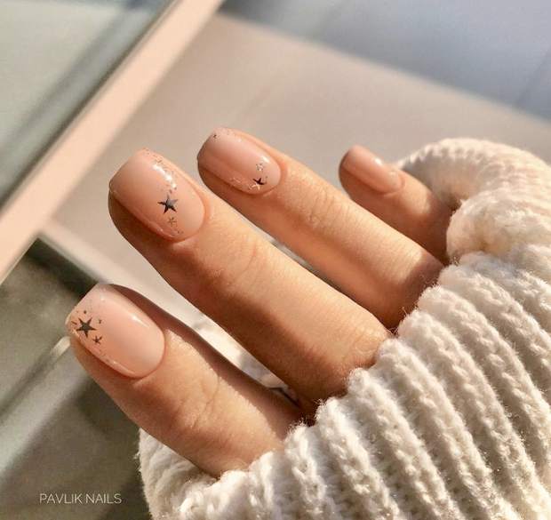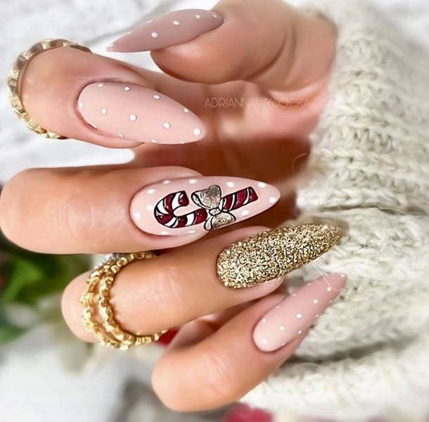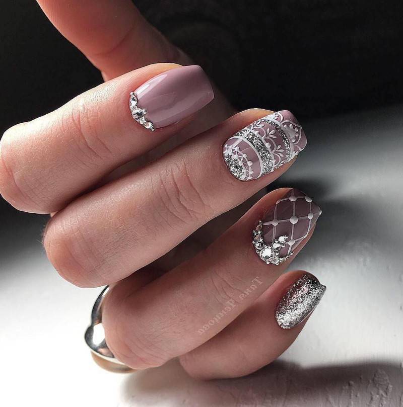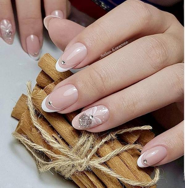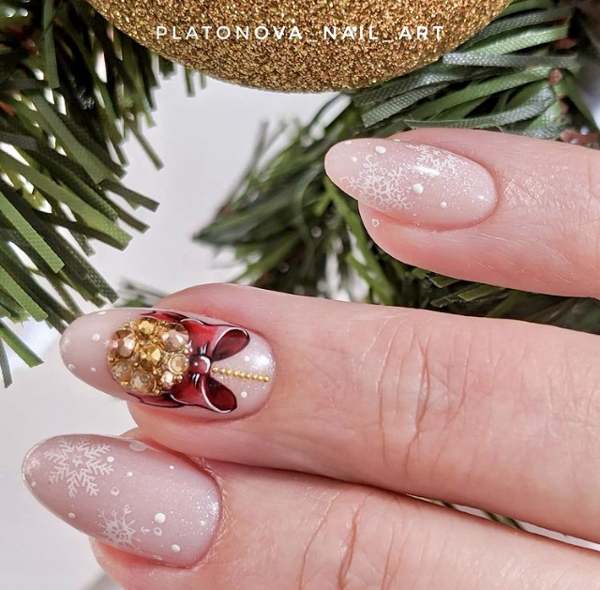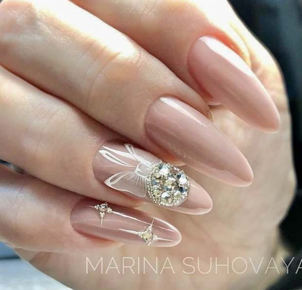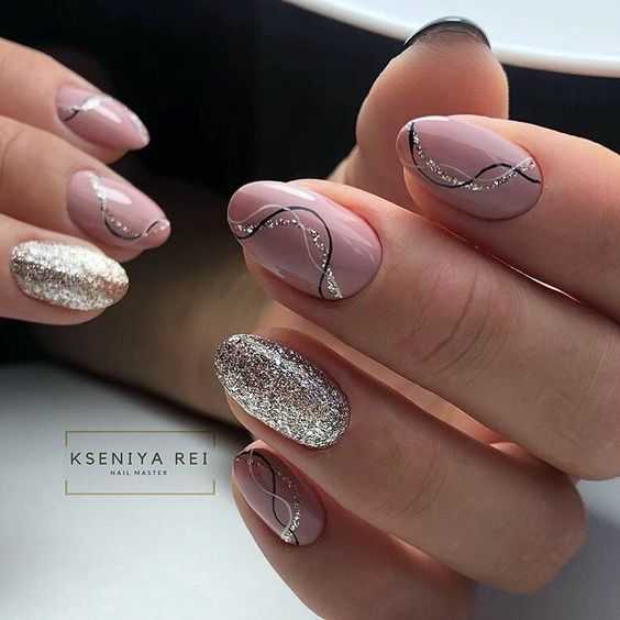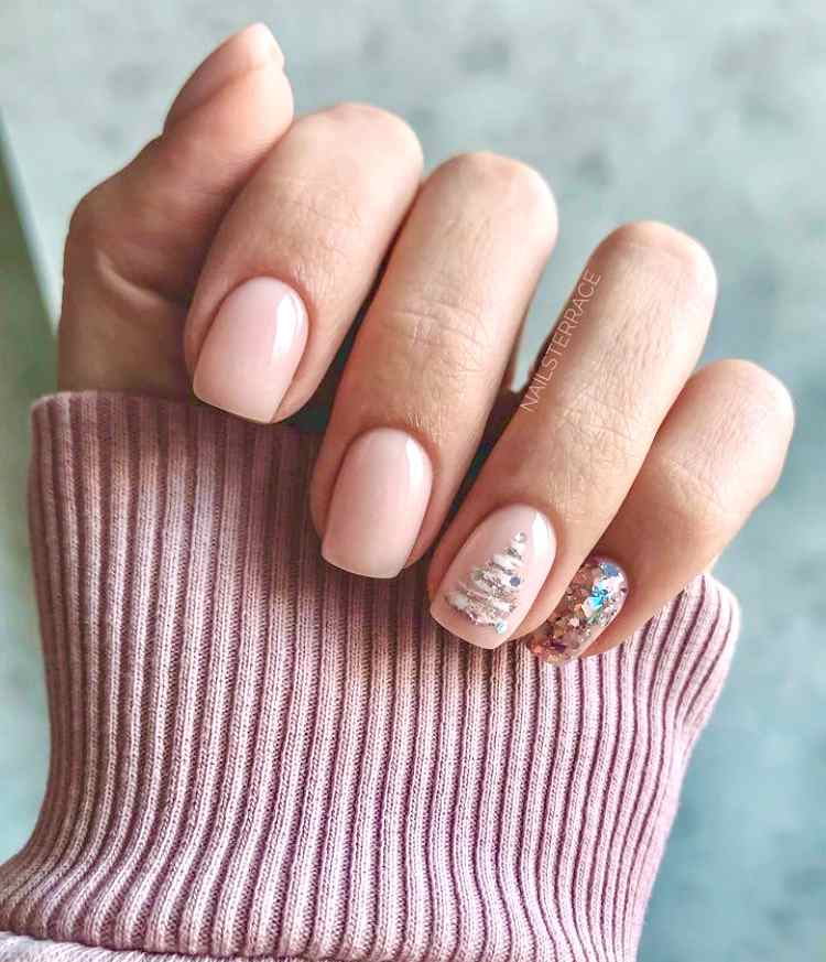 Также, очень празднично и нежно будут смотреться нюдовые ноготки с блестками и рисунками.