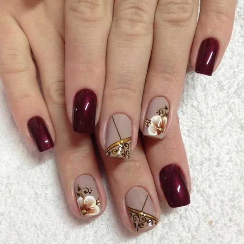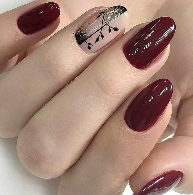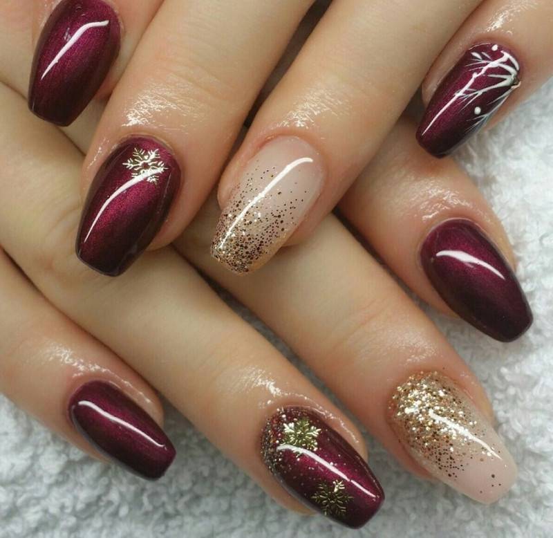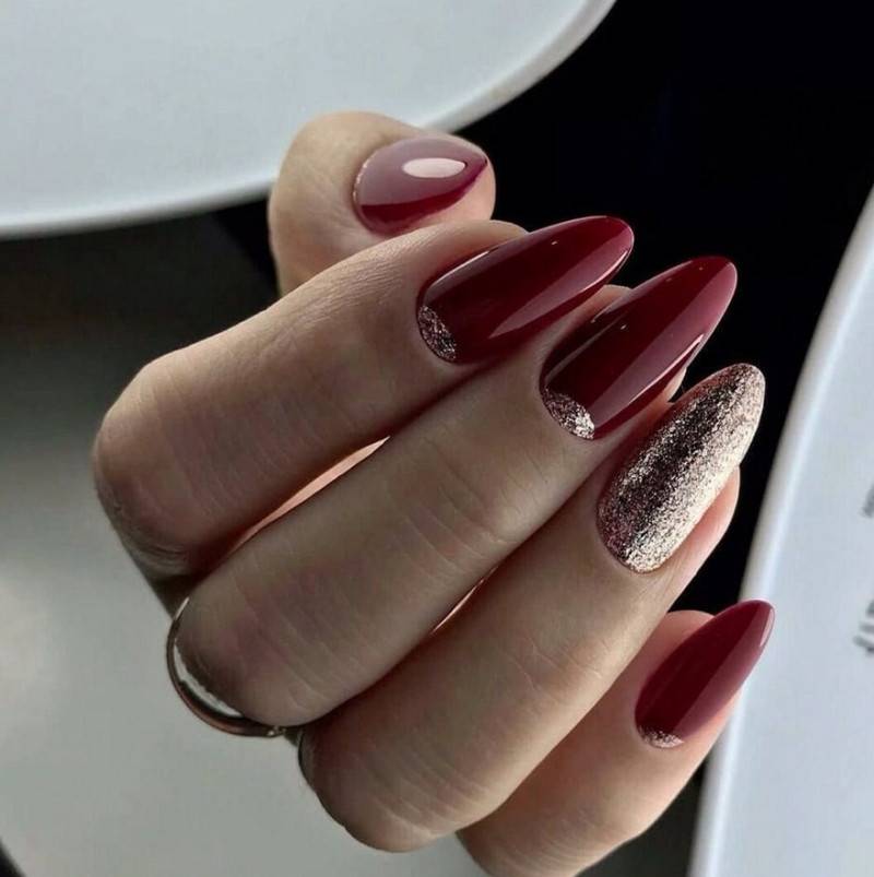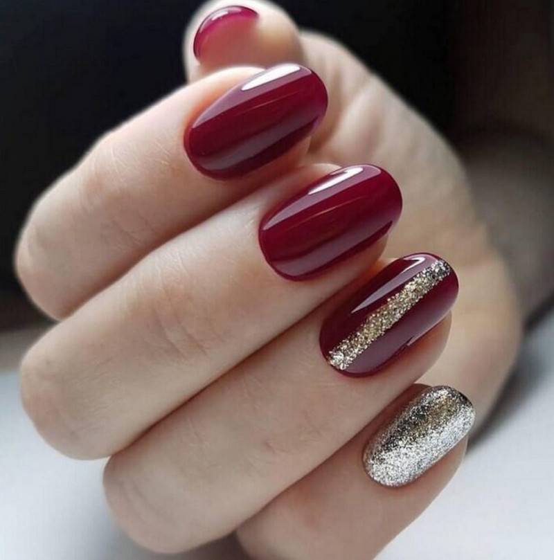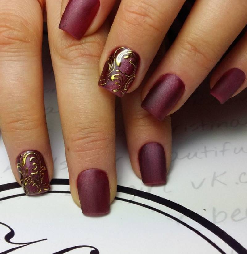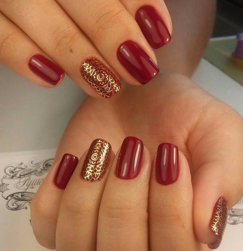 Комбинация любых винных оттенков с золотом считается классической и неизменно используется модницами для создания элегантного или новогоднего дизайна. Она подойдёт для любого торжества, поднимет настроение и послужит завершающим акцентом образа. Использовать золото можно в виде френча с полосками, в форме рисунков, росписи, глиттера, акцентных точек золотым лаком.