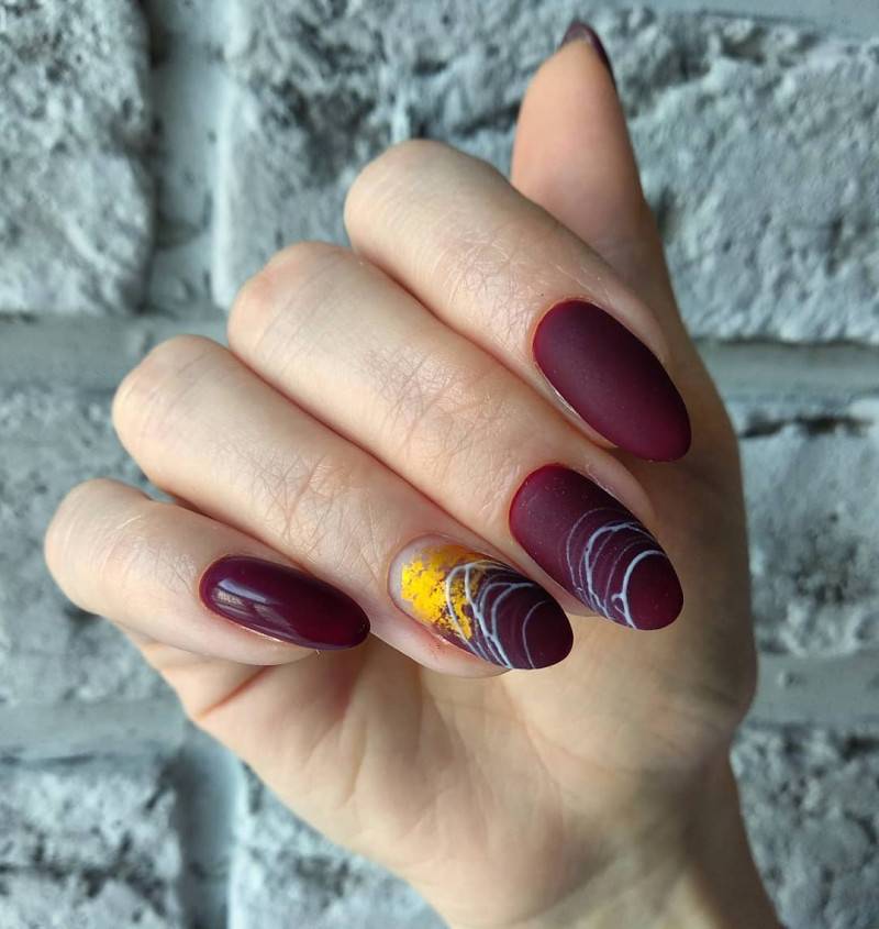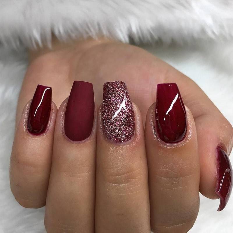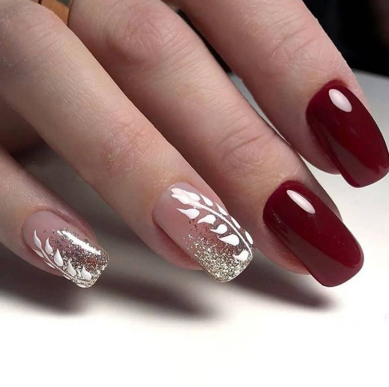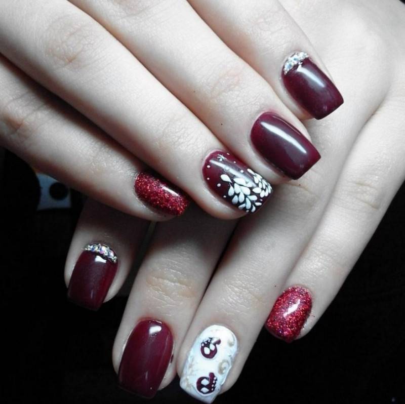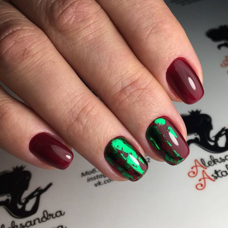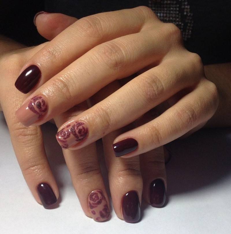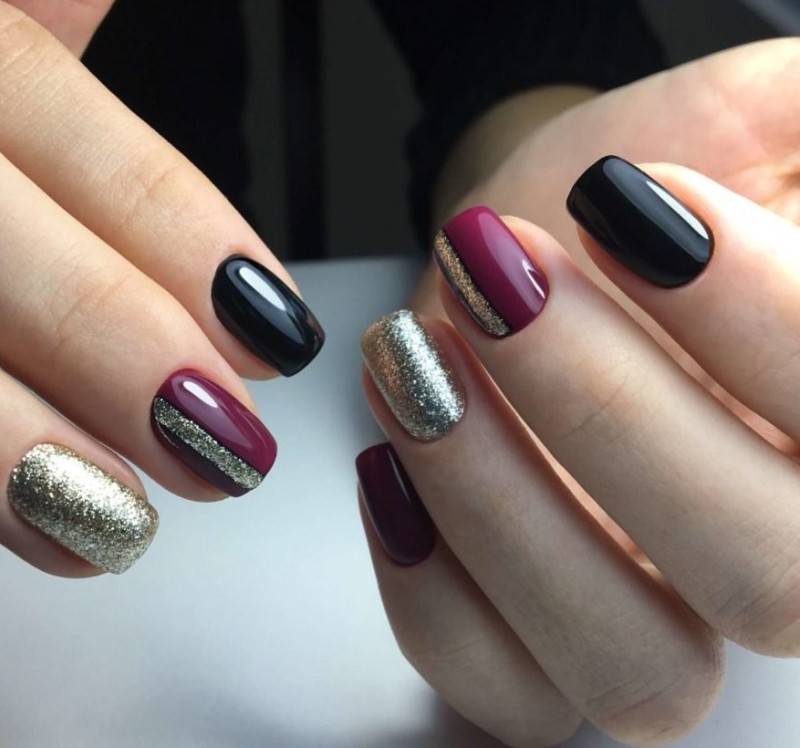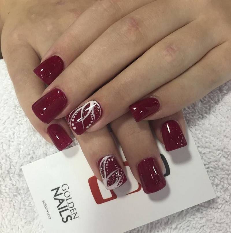 Комбинация любых винных оттенков с золотом считается классической и неизменно используется модницами для создания элегантного или новогоднего дизайна. Она подойдёт для любого торжества, поднимет настроение и послужит завершающим акцентом образа. Использовать золото можно в виде френча с полосками, в форме рисунков, росписи, глиттера, акцентных точек золотым лаком.