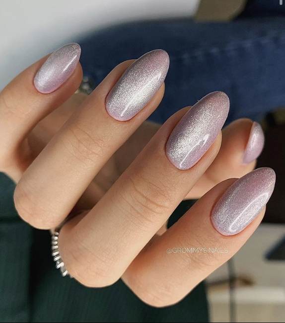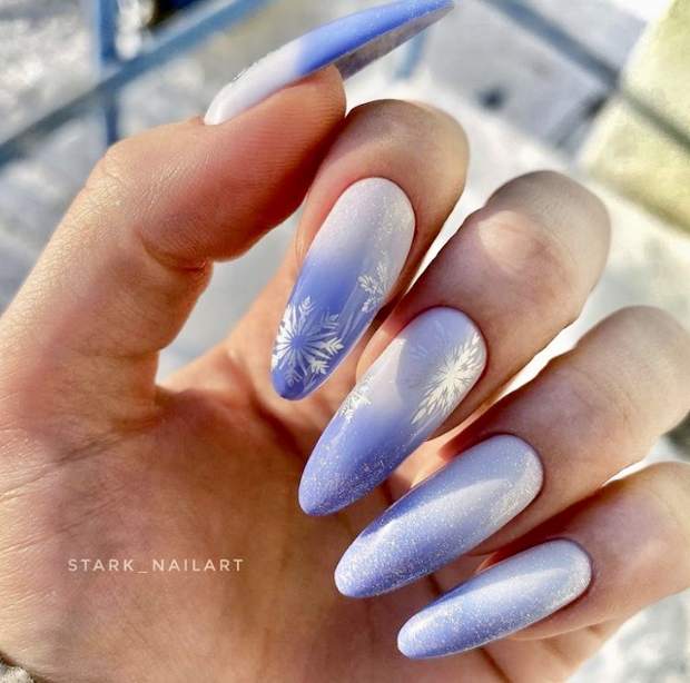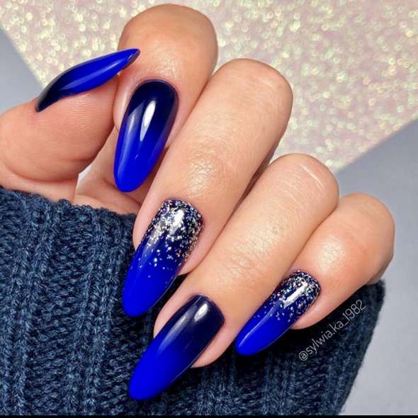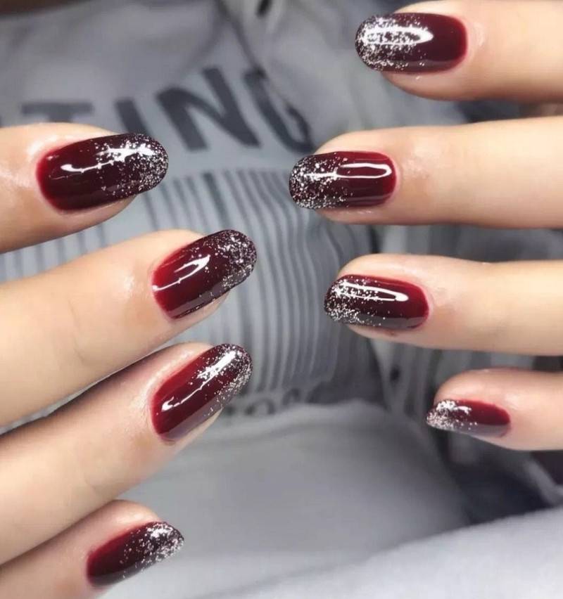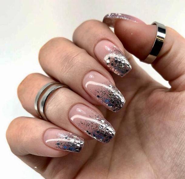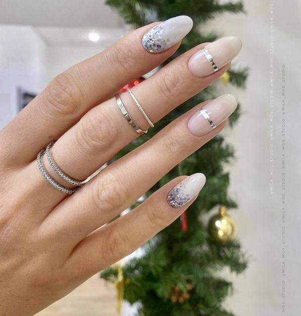 Если хочется красивых переходов на ноготках, то смело делайте градиент. Кроме того, в этом праздничном сезоне очень модно поверх цветного градиента, дополнительно делать легкую растяжку серебряными блестками. Это выглядит очень стильно и нарядно.
