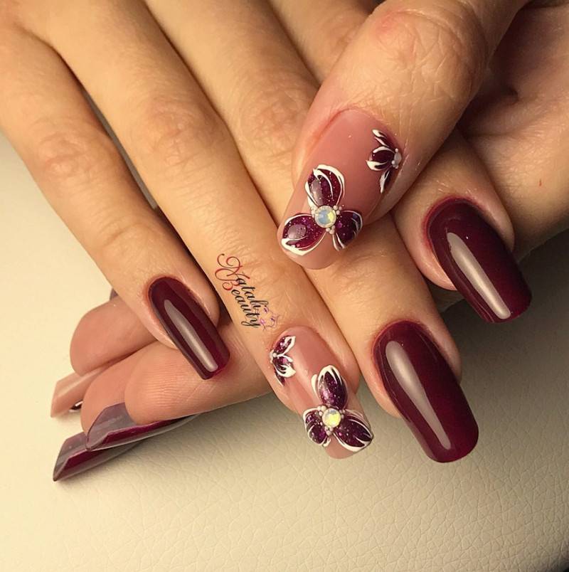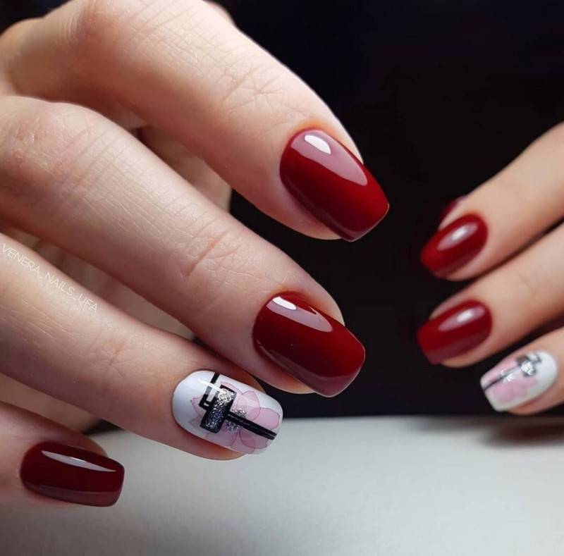 Бордо отлично комбинируется со многими оттенками, причём и с тёмными, и со светлыми. Так, в омбре можно выполнить плавные переходы от темно-бордового до брусничного маникюра с добавлением розового цвета. Контрастные рисунки на ярком фоне и вовсе можно сделать любым светлым тоном.