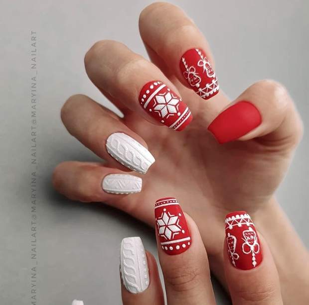 Очень мило и уютно будет смотреться вязаный дизайн. Причем сделать его можно как в нежных молочных или светло-бежевых оттенках, так и в яркой красной цветовой гамме. Дополнить его можно блестящими серебряными блестками, стразами и традиционными тематическими рисунками снежинок.