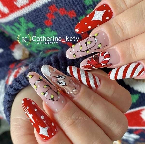 Очень популярными, который год подряд являются тематические Новогодние рисунки на ногтях. Различные Новогодние гирлянды, Дед морозы, снеговики, елки, елочные шары и снежинки. Сочетать их можно с любым цветом и дизайном маникюра. Такие рисунки мастера делают как при помощи кисточки и гель-красок, так и при помощи стемпинга или наклеек. Посмотрите какие красивые и сказочные получаются ноготки с этими рисунками.