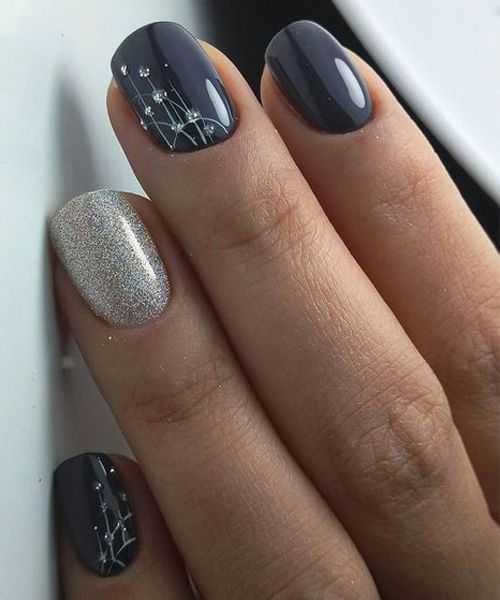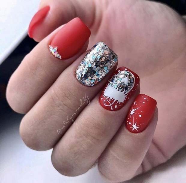 Также, очень стильно и ярко, на коротких ноготках будет смотреться сочетание красного, черного или серого гель-лака, с серебряными блестками или красивыми тематическими Новогодними рисунками на одном-двух ноготках. Например, очень мило выглядят рисунки елочек, звездочек, елочных шаров или зимней варежки. А если еще, ногти покрыть матовым топом, будет вообще шикарно.