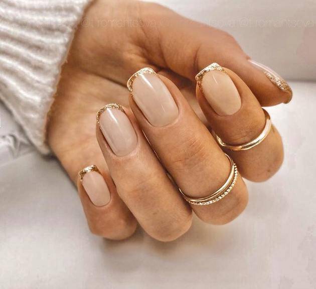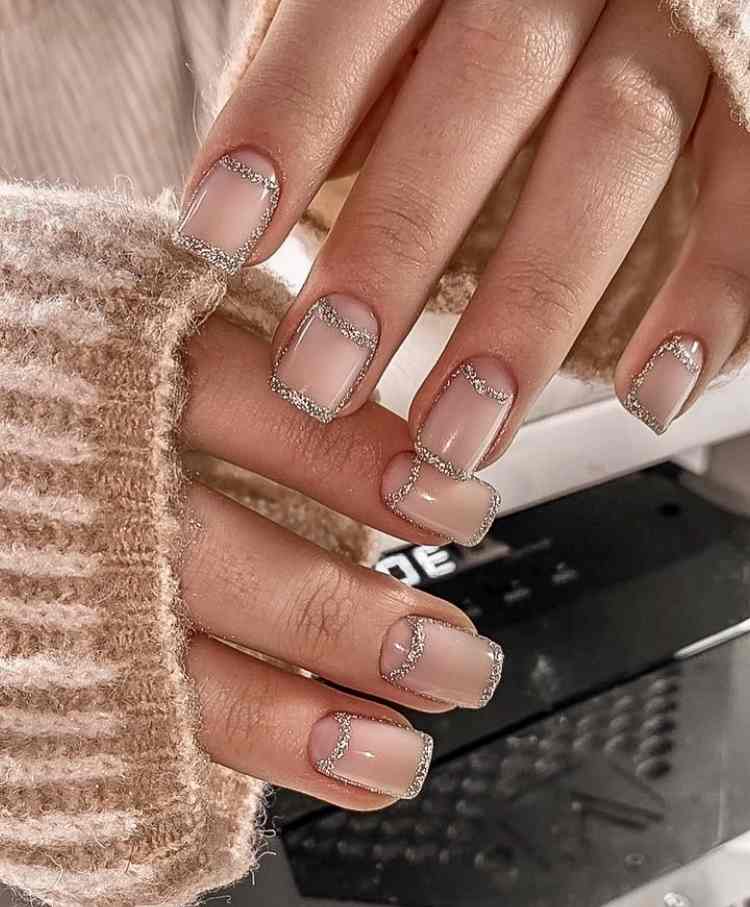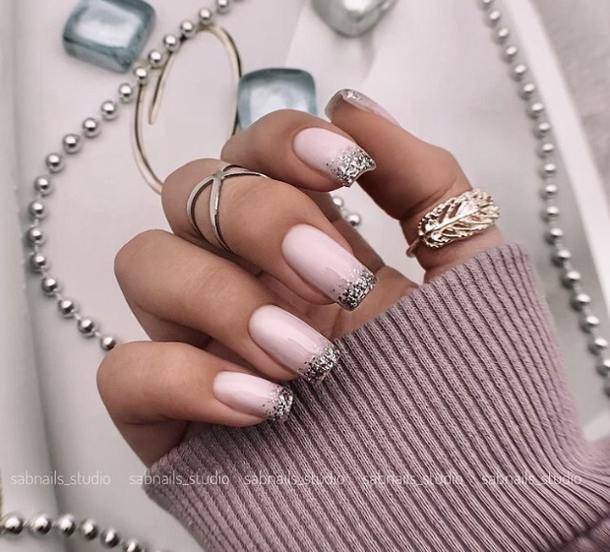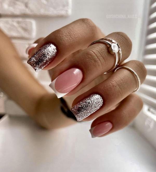 Очень стильно смотрится френч с блестками на коротких ноготках, в любых цветовых решениях.