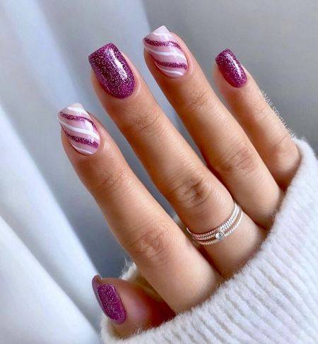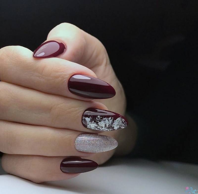 Серебристые переливы, полоски, абстракция, прорисовка лунок или улыбок френча – возможные варианты оформления ноготков вкупе с бордовыми тонами.