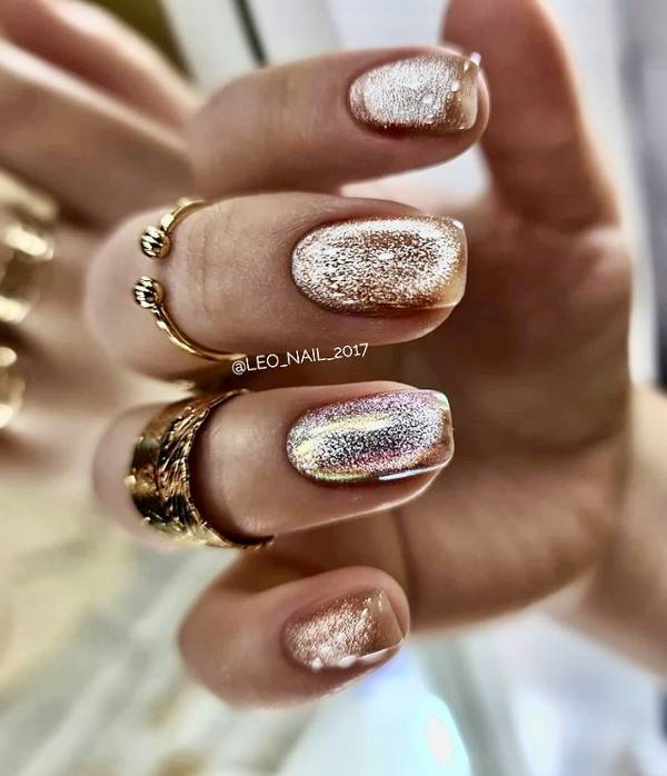 В этом сезоне особым трендом является дизайн ногтей Кошачий глаз в хрустальном, серебряном и золотом цвете. Посмотрите, как красиво он сияет. Можно сделать его в чистом виде, а можно добавить к нему тематические Новогодние рисунки снежинок.