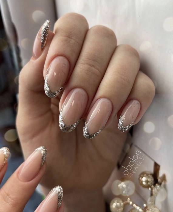 Очень современно и оригинально будет выглядеть блестящий французский маникюр на длинных острых ноготках или на ноготках формы балерина.