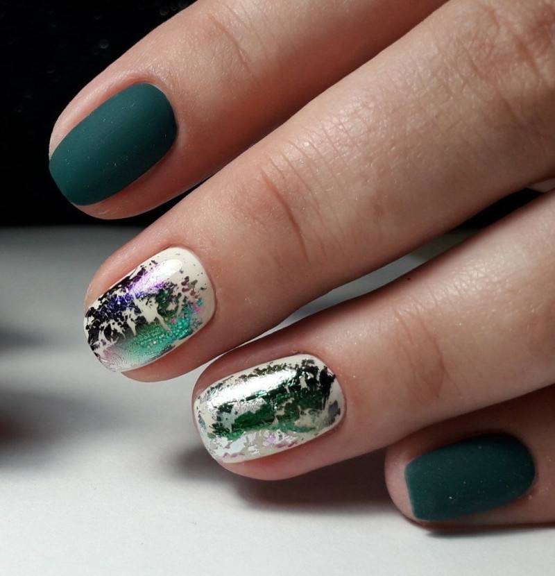 Фольга разных цветов очень стильно и нарядно будет смотреться в вашем Новогоднем дизайне. Ее можно сделать как самостоятельным дизайном, так и скомбинировать с френчем, мазками и брызгами краски, гелем «Паутинка» и любыми блестками.
