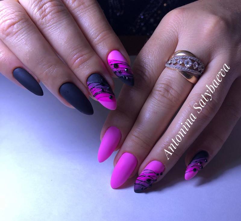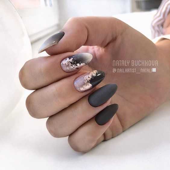 Сейчас часто лучшие мастера маникюра предлагают сочетание матового покрытия и насыщенного градиента на ногтях.
