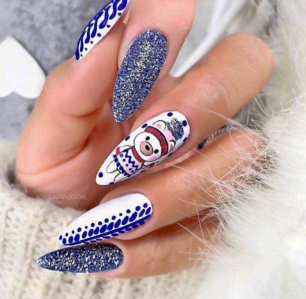 Для девушек с длинными ноготками подойдут и однотонные, и яркие, и составные из нескольких цветов дизайны. Кроме того, на длинных ногтях очень стильно и модно будут выглядеть: блестящий френч, елочные шары, выложенные стразами, вязанный дизайн, различные рисунки снеговиков, оленей, дедов морозов, металлическая втирка, эффектные градиенты и растяжки из блесток.