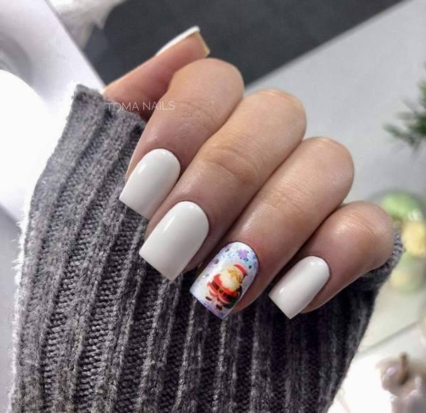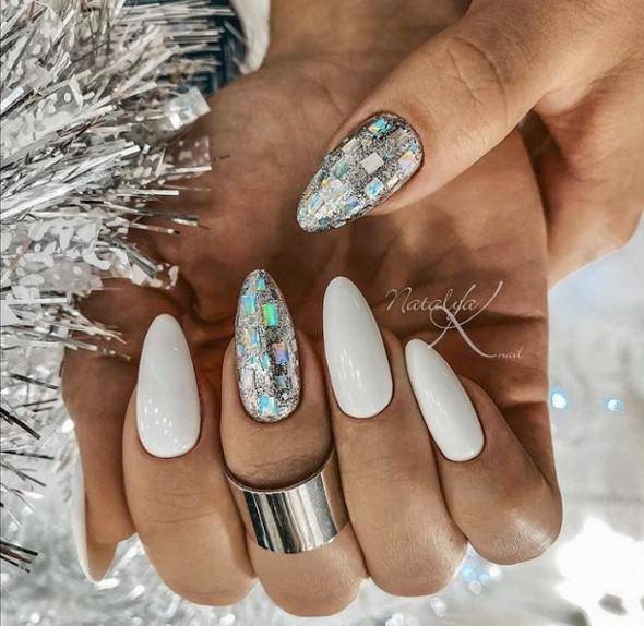 Белый лак подчеркнет ноготки любой длины. Это практически беспроигрышный вариант. Плюс если к нему добавить блесток на несколько пальчиков, или нанести рисунок, будет просто шикарный вариант праздничного дизайна.