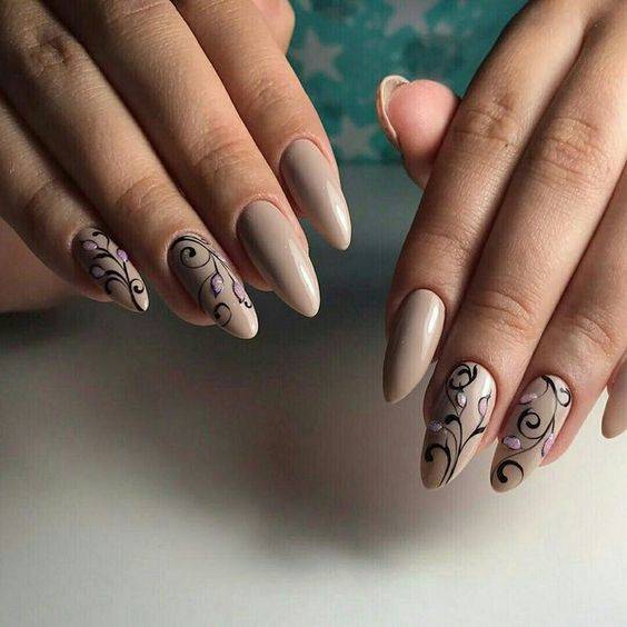 Комбинации с бежевыми и другими нюдовыми оттенками – идеальный способ создать классический нейл-дизайн. Бежевый подходит для техники градиента, узоров, акцентов, хаотичных мазков. Также он разбавляет бордо, делает его более нейтральным, менее насыщенным. Такой дуэт хорош для повседневного маникюра. Он считается женственным, сдержанным. Для разнообразия можно применять матовый бежевый лак на фоне глянцевого тёмного покрытия.