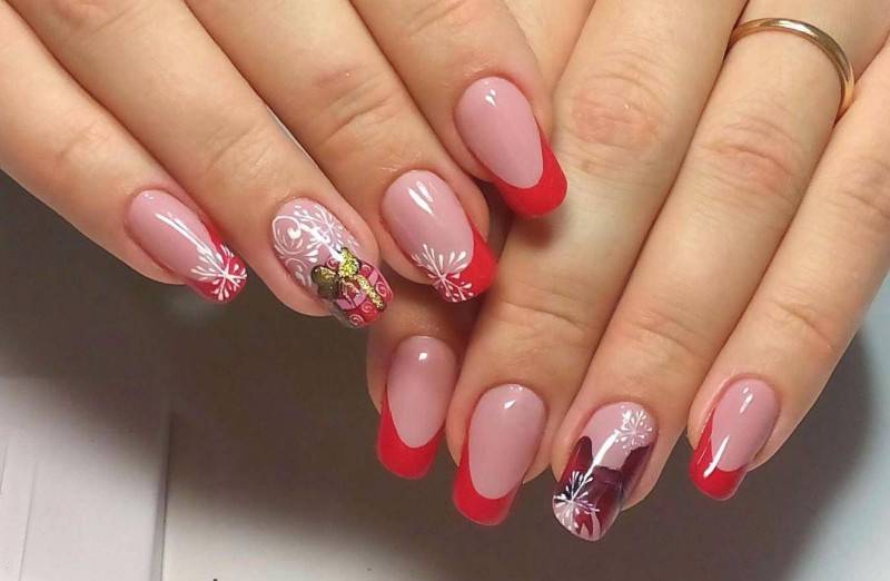 Излюбленный многими современными модницами дизайн ногтей во французском стиле не нуждается в представлении, поэтому мы не будем тратить время наших читателей на обсуждения характеристик этой популярной техники. Для встречи Нового года прекрасно подойдёт классический френч и френч-миллениум, маникюр, в котором улыбка выполнена в одном из модных тонов либо дизайн, где на кончике ногтя изображены снежинки или ажурные завитки по типу морозных узоров. Также, как вариант, можно оформить на ногтях двойную или скошенную улыбку металлизированными полосками и совместить технику с другими нейл-идеями.