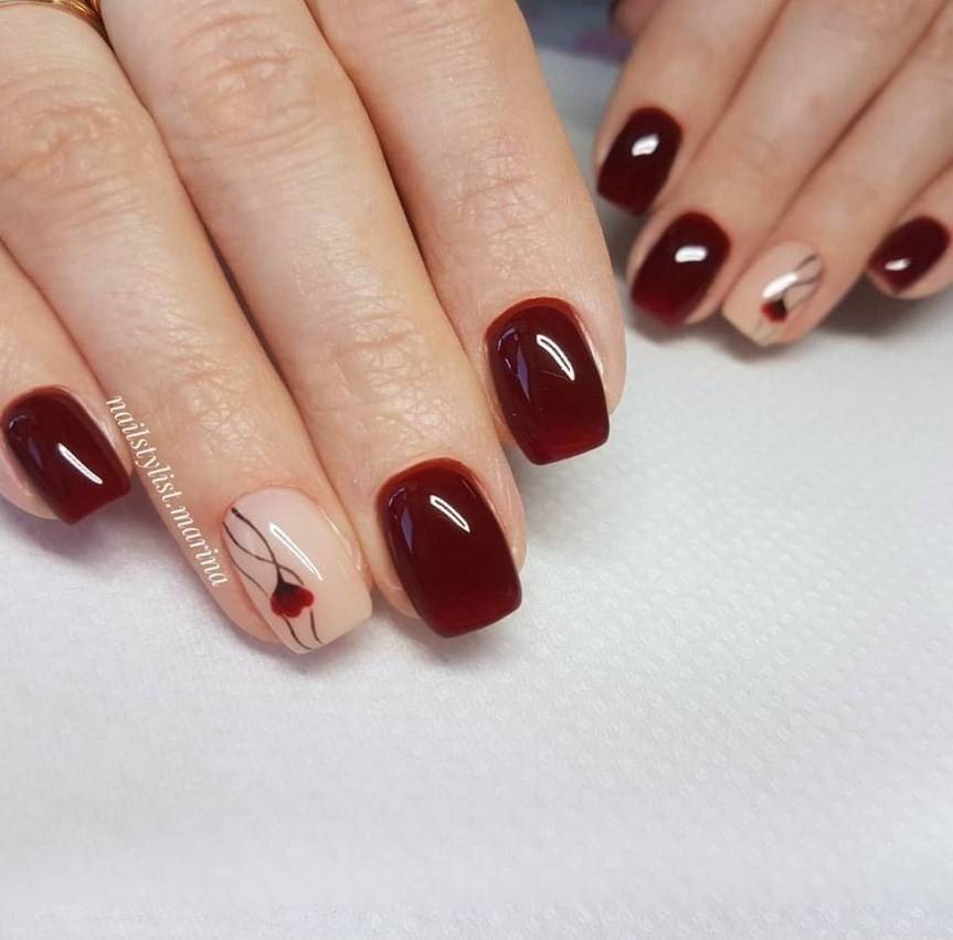 Бордо отлично комбинируется со многими оттенками, причём и с тёмными, и со светлыми. Так, в омбре можно выполнить плавные переходы от темно-бордового до брусничного маникюра с добавлением розового цвета. Контрастные рисунки на ярком фоне и вовсе можно сделать любым светлым тоном.