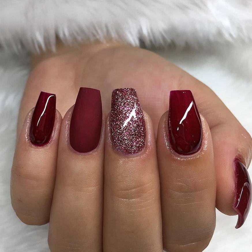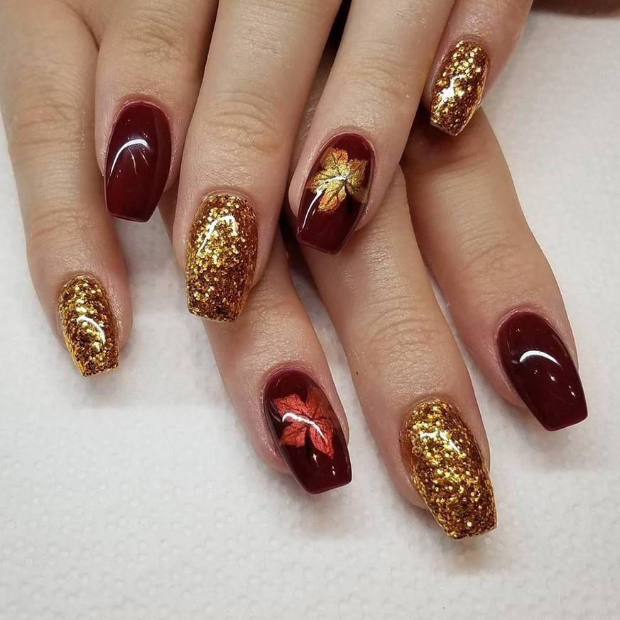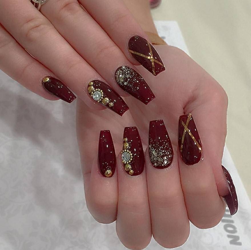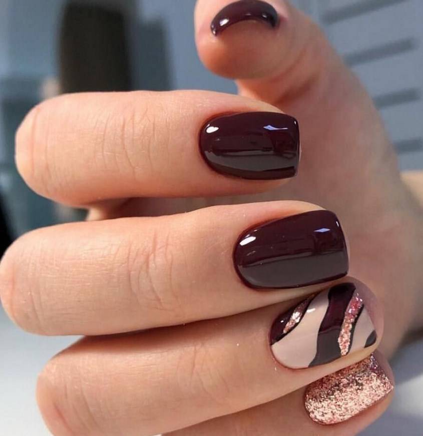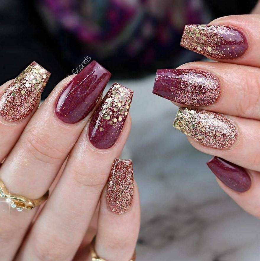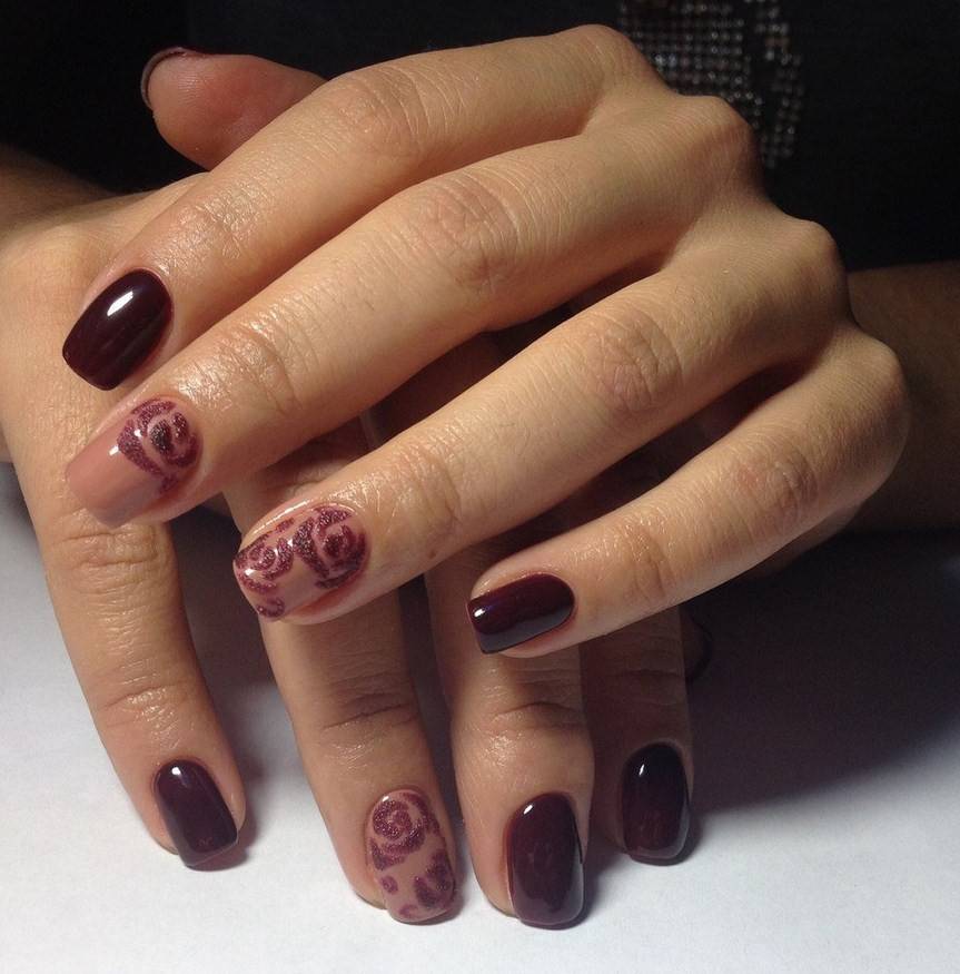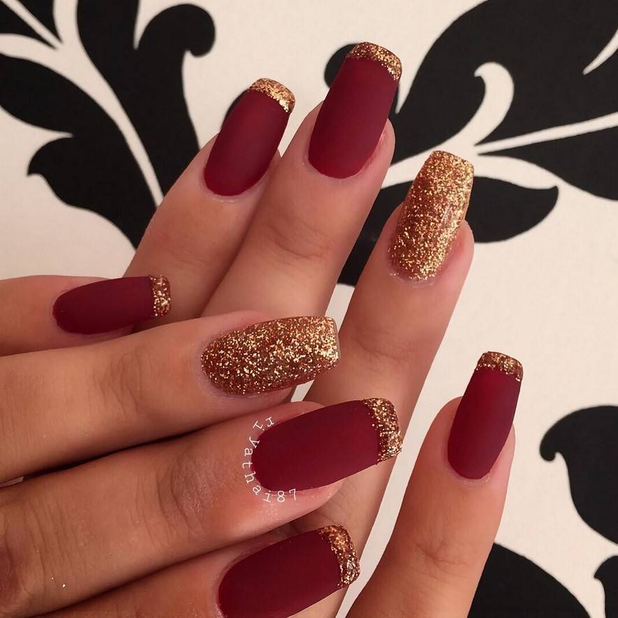 Комбинация любых винных оттенков с золотом считается классической и неизменно используется модницами для создания элегантного или новогоднего дизайна. Она подойдёт для любого торжества, поднимет настроение и послужит завершающим акцентом образа. Использовать золото можно в виде френча с полосками, в форме рисунков, росписи, глиттера, акцентных точек золотым лаком.