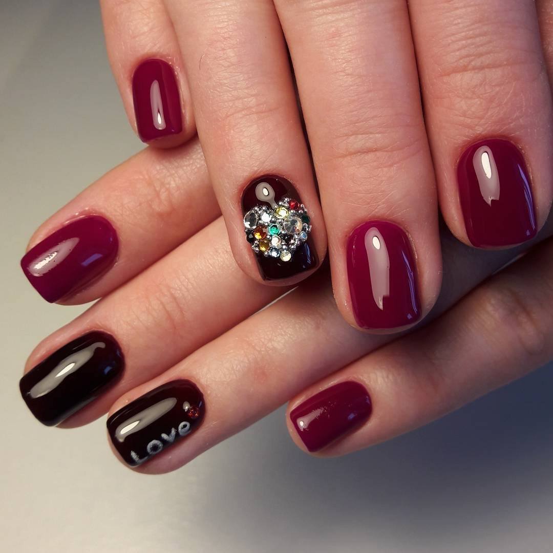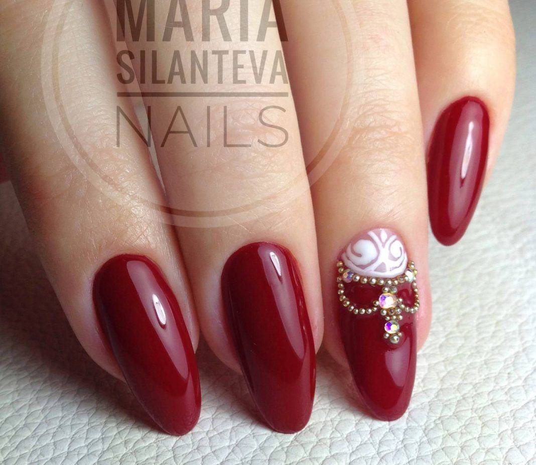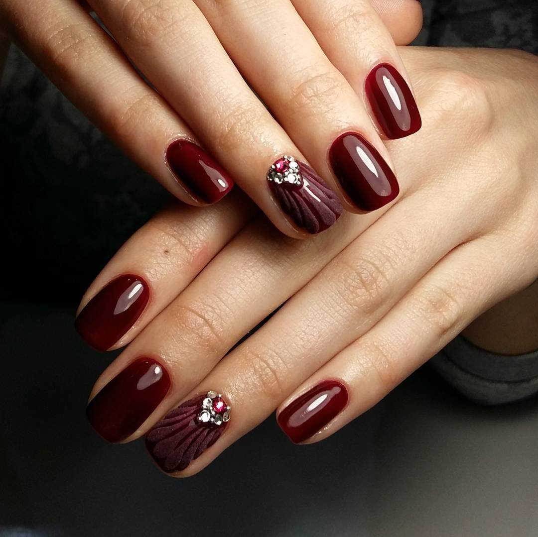 - Красные и бордовые. Оттенки этих цветов изысканно смотрятся и на коротких, и на длинных ногтях. Винные, вишнёвые оттенки в сочетании со стразами создают великолепные вечерние образы.