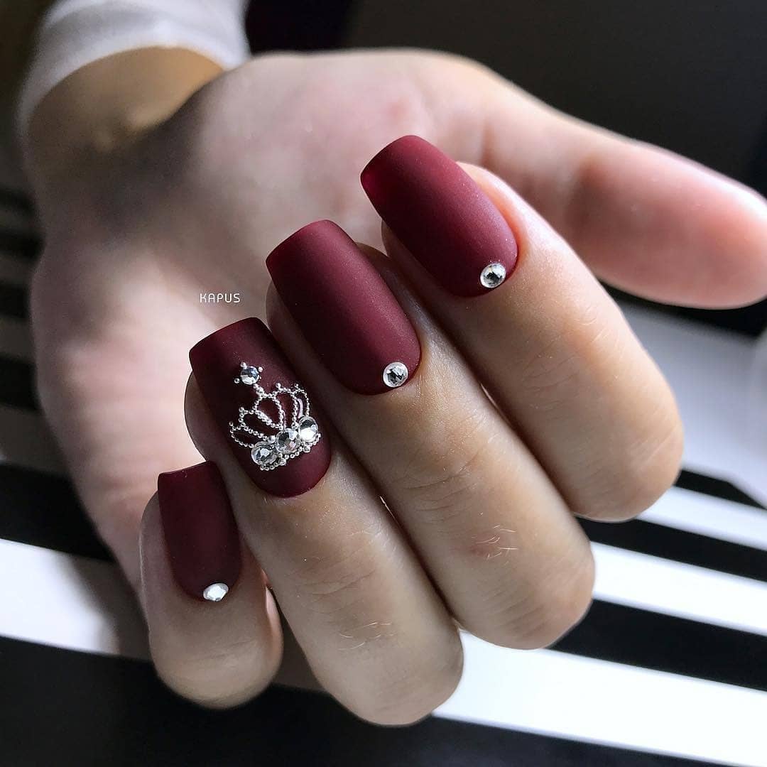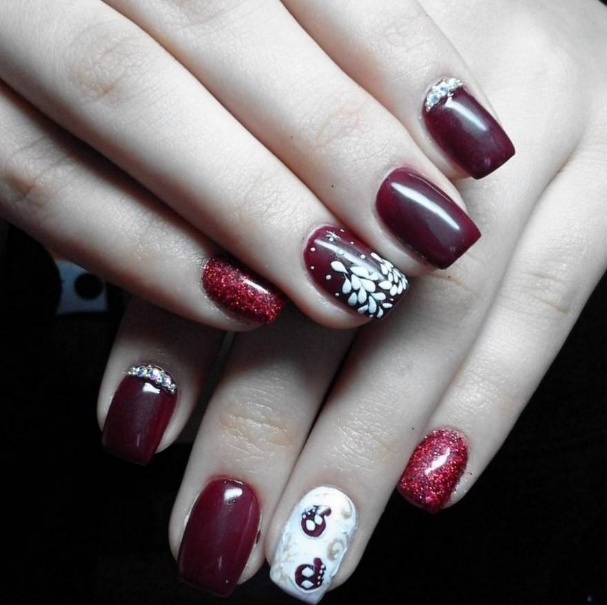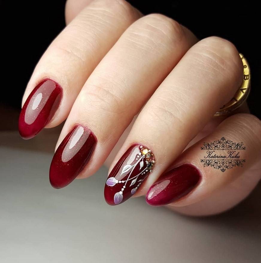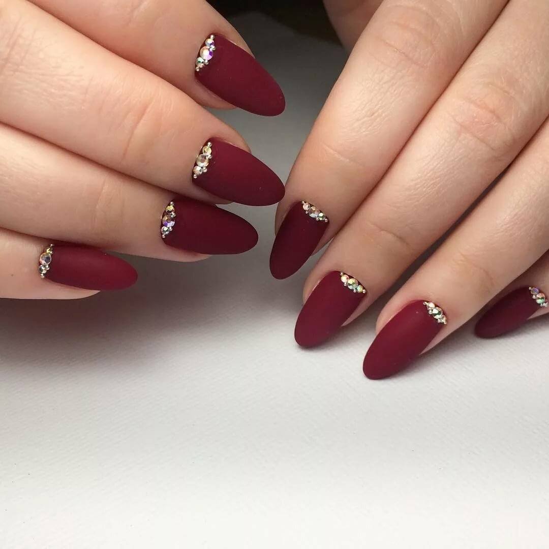- Красные и бордовые. Оттенки этих цветов изысканно смотрятся и на коротких, и на длинных ногтях. Винные, вишнёвые оттенки в сочетании со стразами создают великолепные вечерние образы.