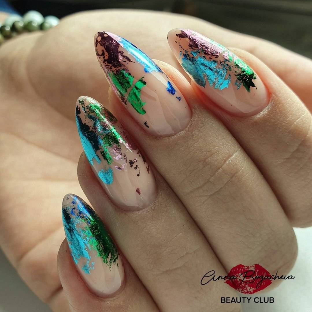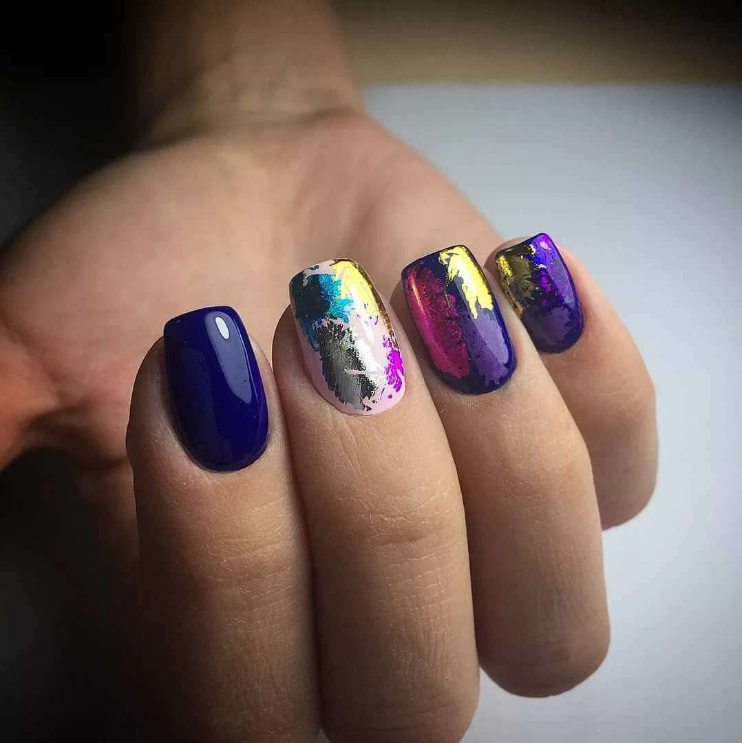 Фольга разных цветов очень стильно и нарядно будет смотреться в вашем Новогоднем дизайне. Ее можно сделать как самостоятельным дизайном, так и скомбинировать с френчем, мазками и брызгами краски, гелем «Паутинка» и любыми блестками.