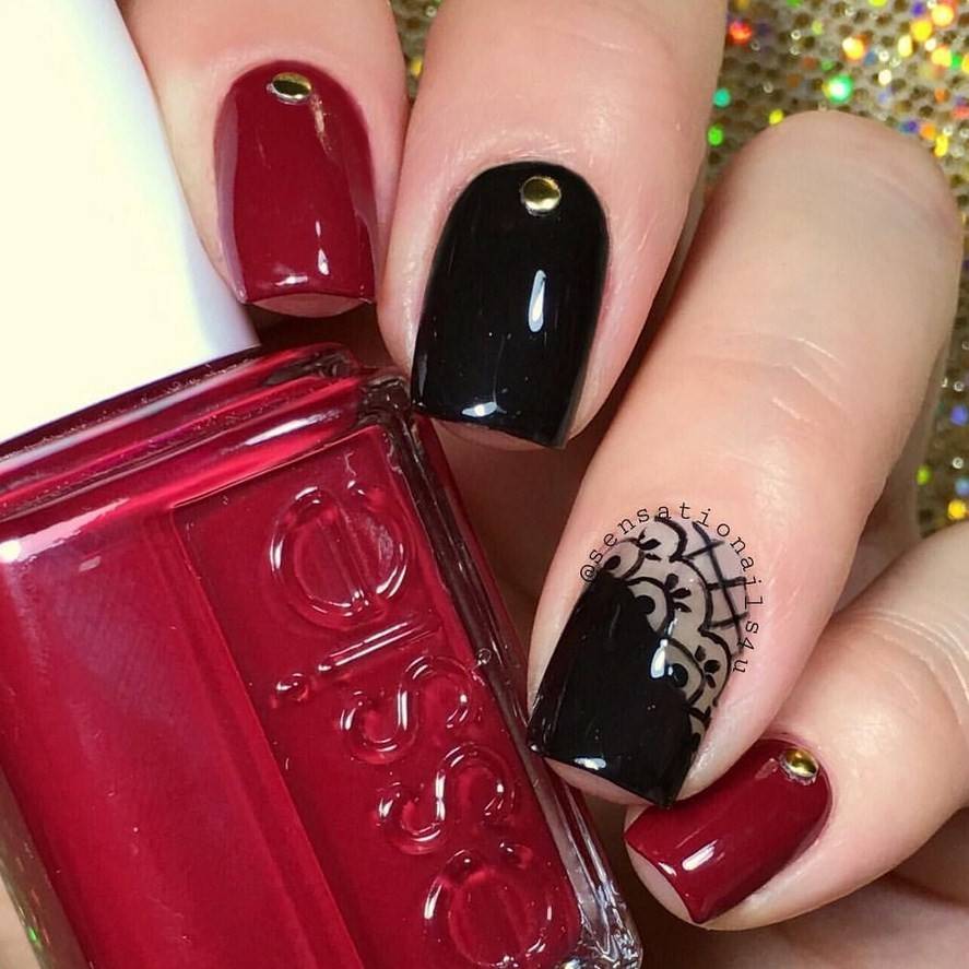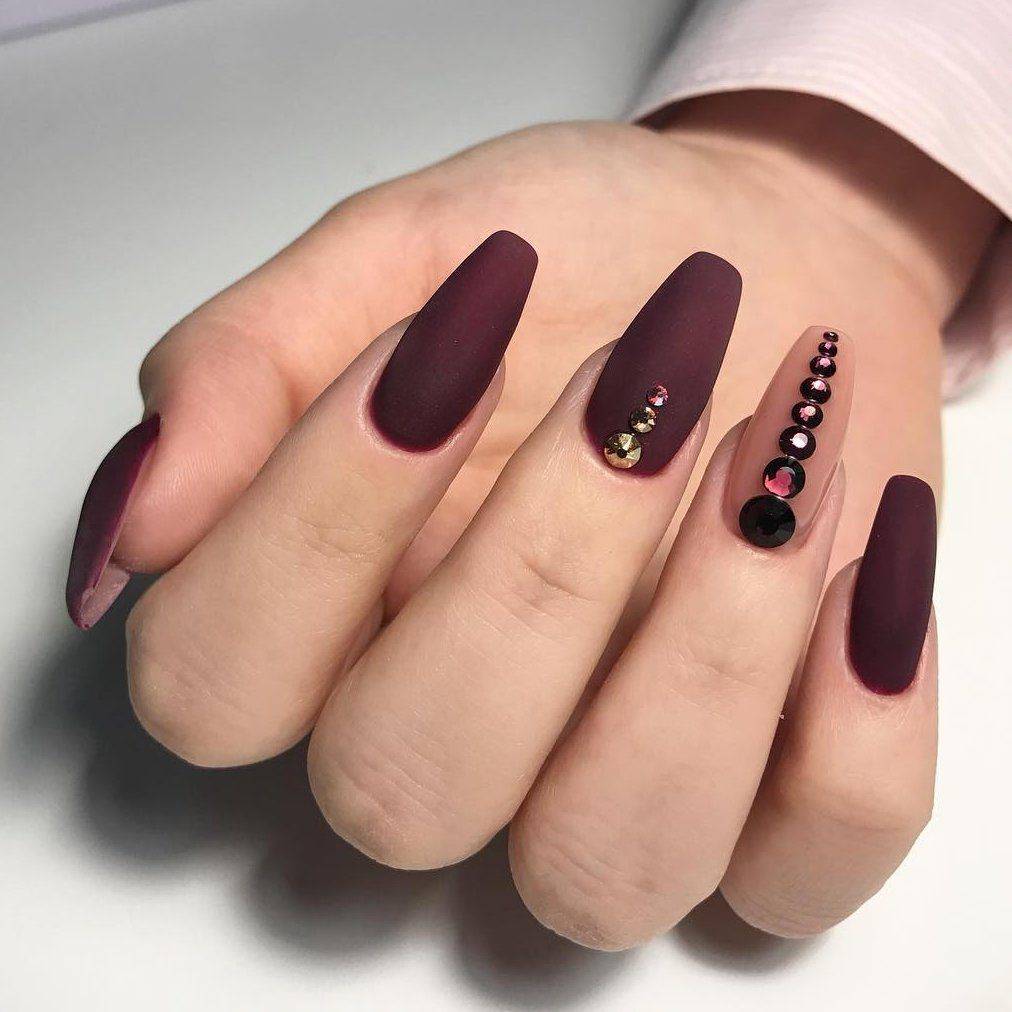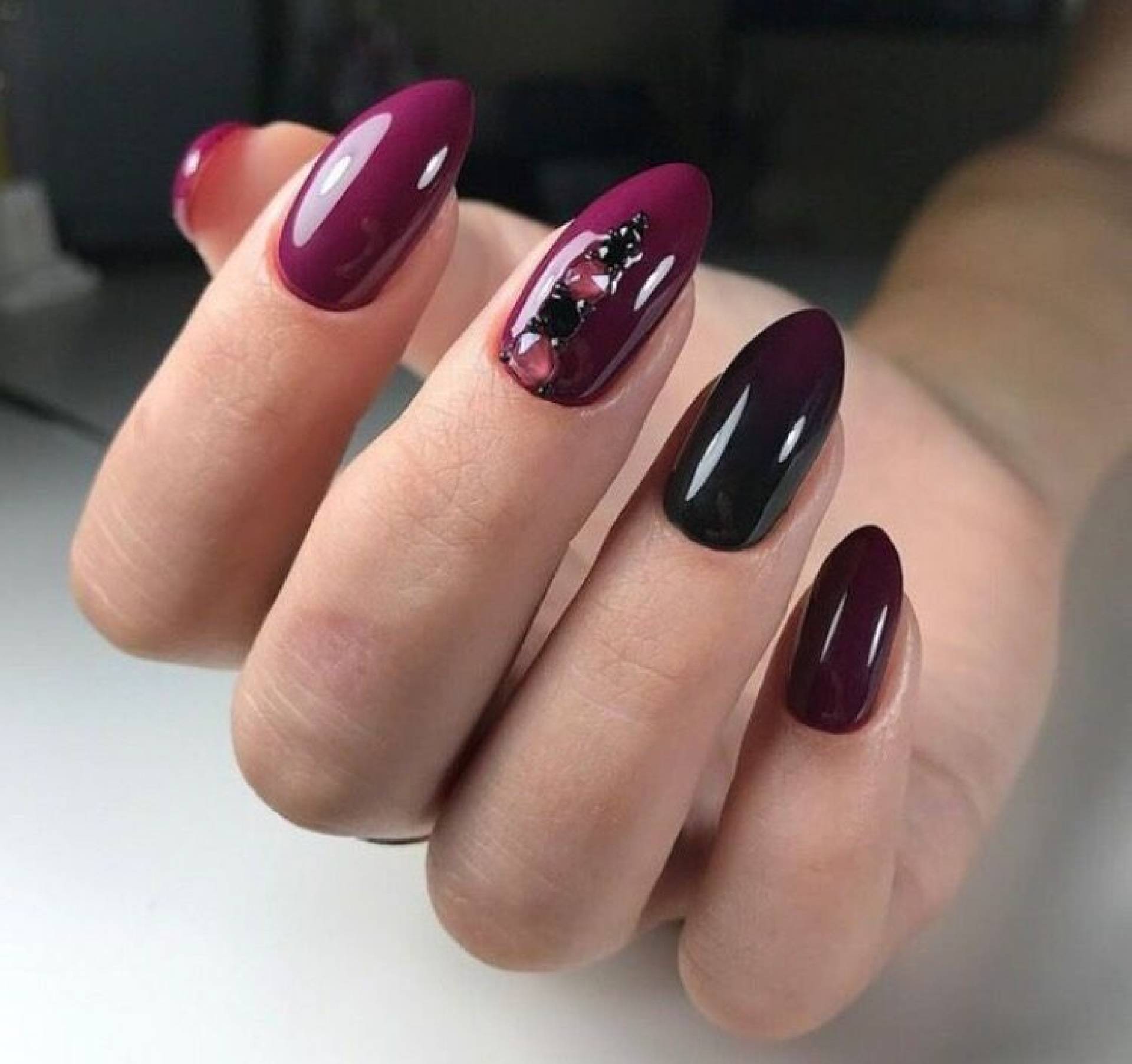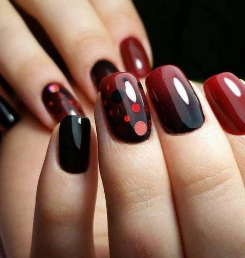 Подобный дизайн даже по фото может показаться мрачным, траурным. Чтобы такого ощущения не сложилось, нужно подобрать правильный оттенок бордо. Лучше сделать его светлым, например, винным или нежно-брусничным. Чёрный с бордовым отлично комбинируются в технике градиент. Его выполняют с переходом от самого тёмного основания к светлым кончикам ногтей. Для торжественных случаев можно окрасить чёрным лаком один-два ногтя на руке и декорировать стразами – дизайн получится дерзким и смелым.
