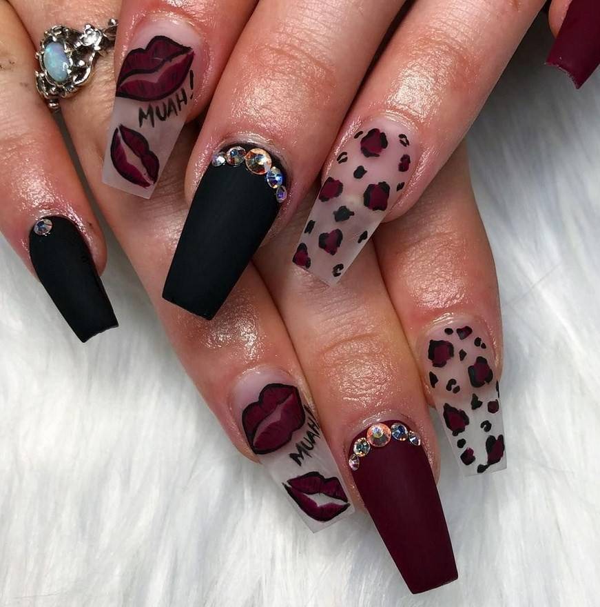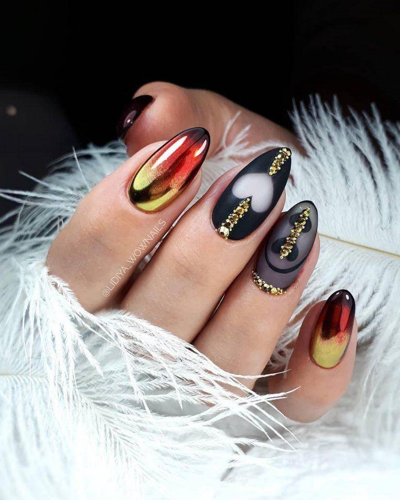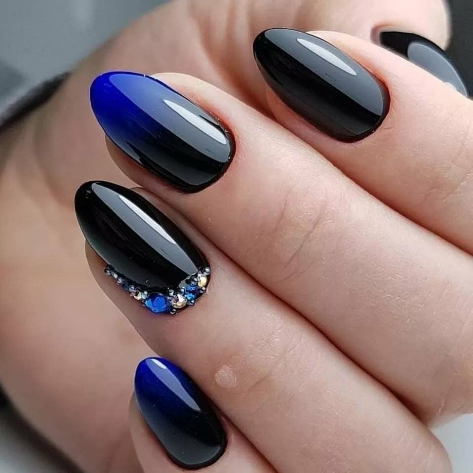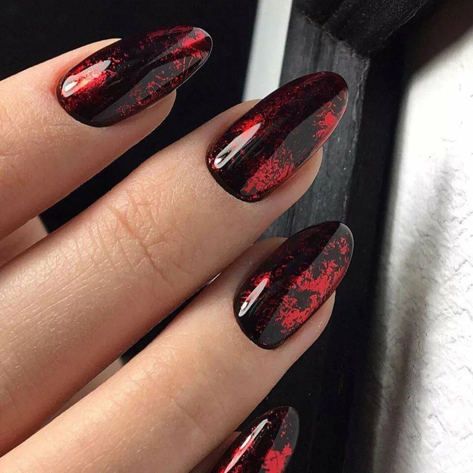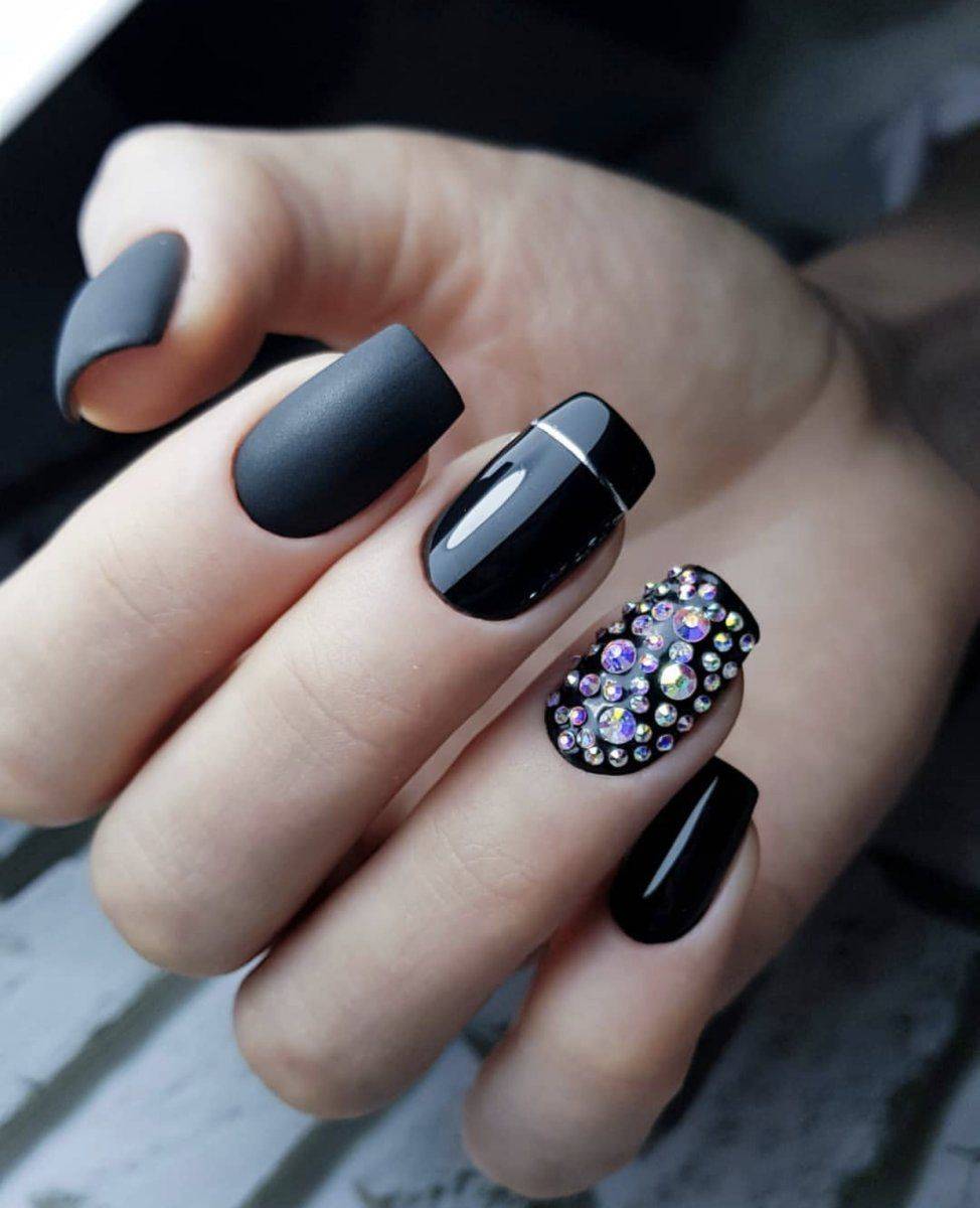 Подобный дизайн даже по фото может показаться мрачным, траурным. Чтобы такого ощущения не сложилось, нужно подобрать правильный оттенок бордо. Лучше сделать его светлым, например, винным или нежно-брусничным. Чёрный с бордовым отлично комбинируются в технике градиент. Его выполняют с переходом от самого тёмного основания к светлым кончикам ногтей. Для торжественных случаев можно окрасить чёрным лаком один-два ногтя на руке и декорировать стразами – дизайн получится дерзким и смелым.